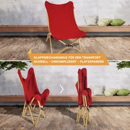 The connection points between the fabric and the bamboo frame are additionally reinforced, allowing a load capacity of up to 120kg. The bamboo frame with its innovative folding mechanism makes it easy to assemble and disassemble the chair. It is ready for use in seconds with just one movement and can be stowed away to save space. No more annoying space problems when packing your car boot, motorhome or caravan. When not in use and stored in the cellar or garage, the robust carry bag protects the chair from damage and dust.