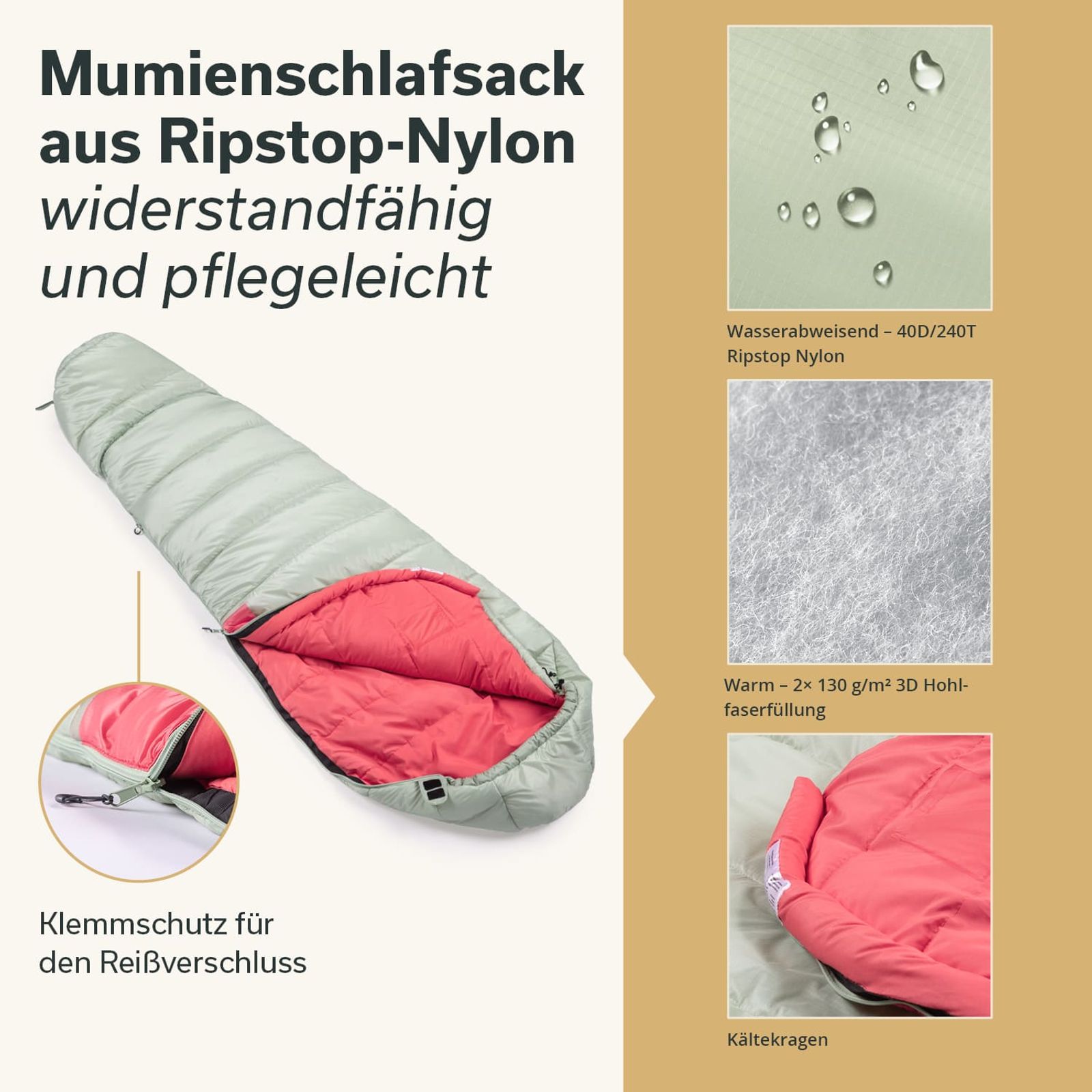 - Close-fitting mummy shape for optimum retention of body heat