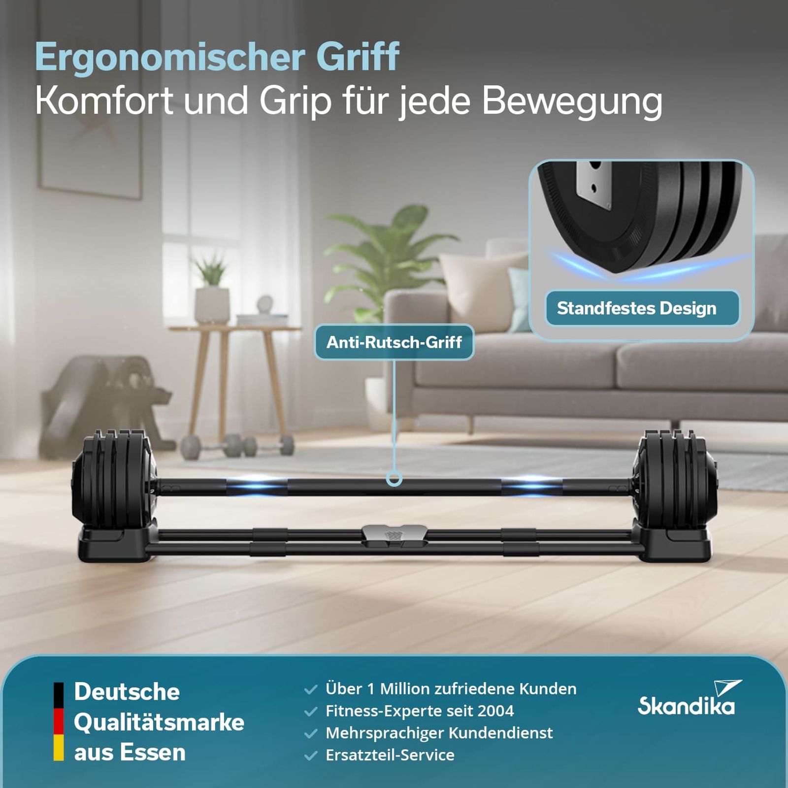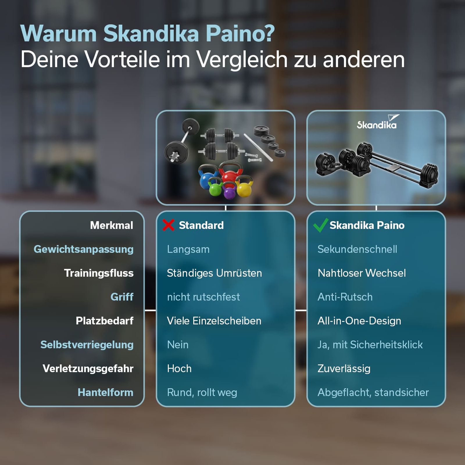 Mit dem Skandika 3-in-1 Hantelset Paino wird das Heimstudio zur vollwertigen Kraftstation. Dieses innovative Trainingsset vereint drei essenzielle Trainingsgeräte in einem einzigen kompakten System und bietet damit maximale Vielseitigkeit auf minimalem Raum. Die mitgelieferten Gewichtsscheiben lassen sich wahlweise als Kurzhantel, Langhantel oder Kettlebell nutzen, sodass nahezu jede Kraftübung realisierbar wird. Dank des intelligenten Schnellwechselsystems mit Selbstverriegelungstechnik und insgesamt 12 Gewichtsstufen pro Konfiguration ermöglicht das Set progressives und abwechslungsreiches Training für jedes Leistungsniveau.