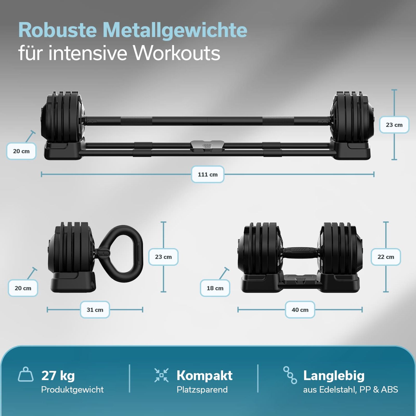 - Platzsparendes All-in-One-Design ersetzt ein komplettes Hantel-Sortiment