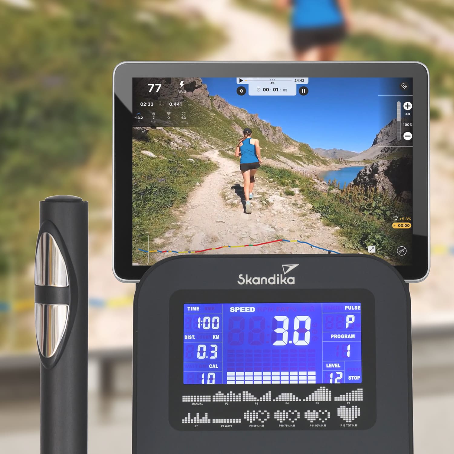 Dank des integrierten Bluetooth-Empfängers ist der Carbon P18 kompatibel mit beliebten Fitness-Apps wie Kinomap, für abwechslungsreiche und motivierende Workouts. Die integrierte Halterung hält Endgeräte während des Trainings sicher.
