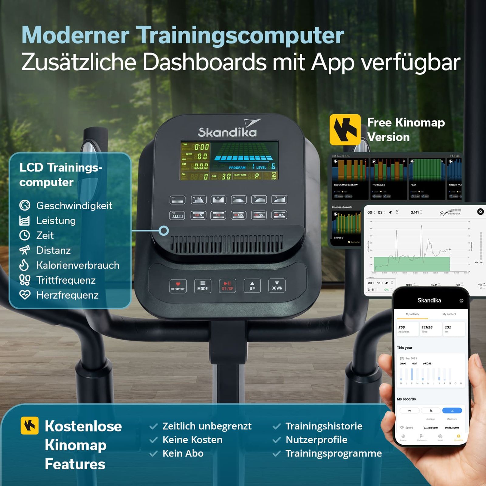 Die fixierten Handgriffe verfügen über Pulssensoren damit während des Trainings eine bequeme Überwachung der Herzfrequenz erfolgen kann. Der eingebaute Empfänger ermöglicht ebenfalls die Übertragung der Herzfrequenz mittels eines Skandika-Brustgurtes (optional erhältlich) oder einem anderen handelsüblichen 5,3-kHz-Brustgurtes.