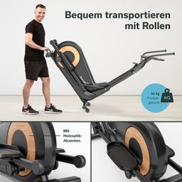 Dank integrierter Transportrollen vorne und einem praktischen Griff hinten lässt sich das Gerät mühelos an verschiedene Orte verschieben. Mit einer maximalen Belastbarkeit von 150 kg bietet der Crosstrainer zuverlässige Leistung und Stabilität, selbst bei intensiven Trainingseinheiten.