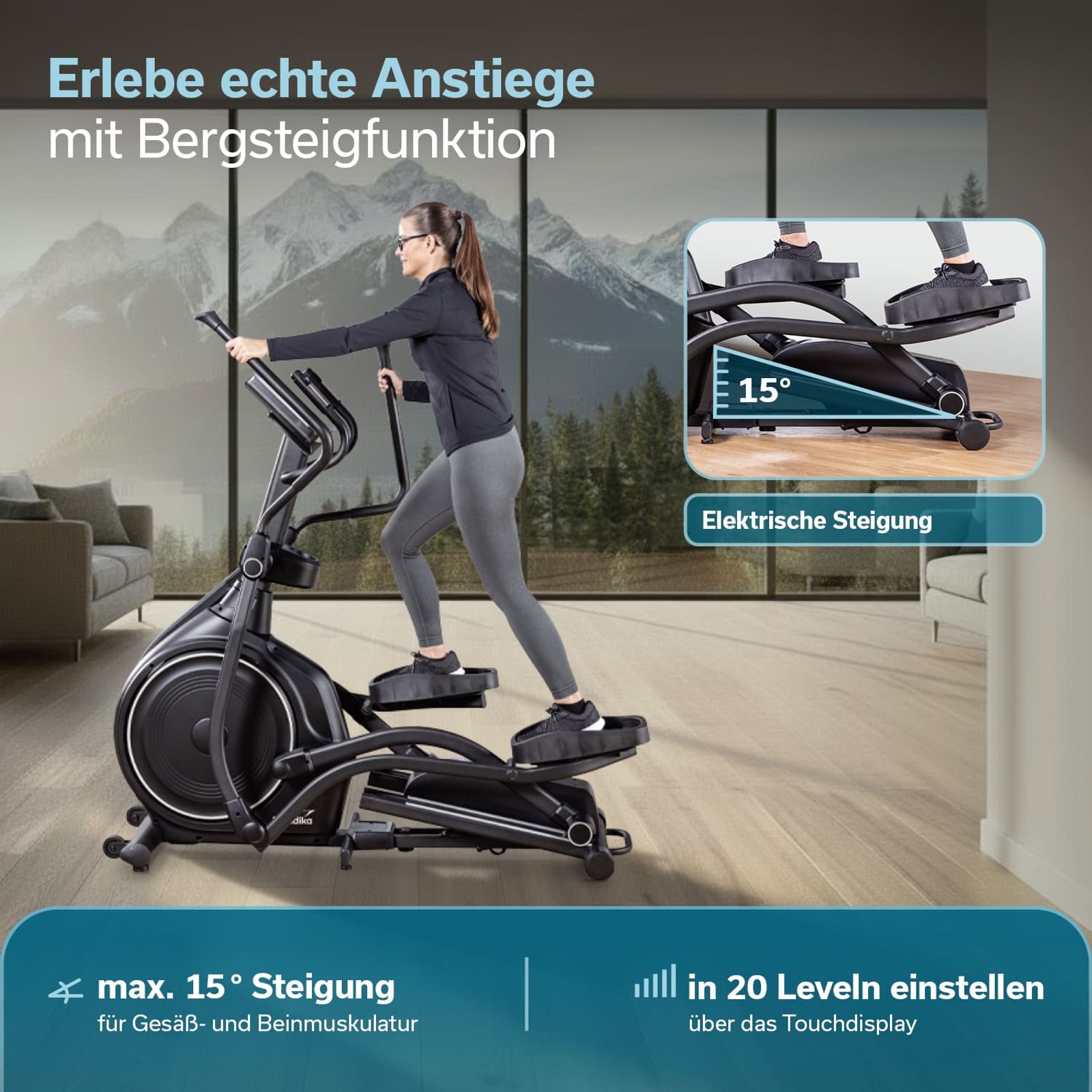 Für ein intensiveres Workout sorgt die Bergsteig-Funktion mit bis zu 15° Steigung, bequem einstellbar in 20 Stufen über den Bordcomputer. Die gezielte Beanspruchung von Gesäß- und Oberschenkelmuskulatur bringt Abwechslung und fordert selbst erfahrene Trainierende.