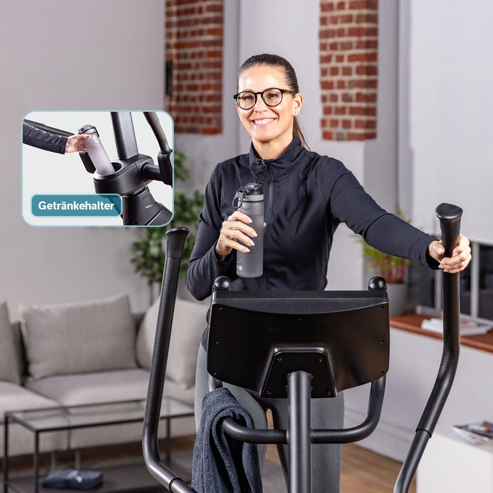 - Pulssensoren an den Handgriffen, große Pedale, Trinkflaschenhalterung, Tablet-Halterung