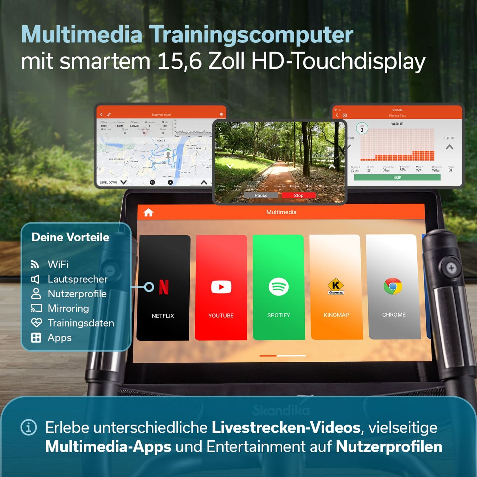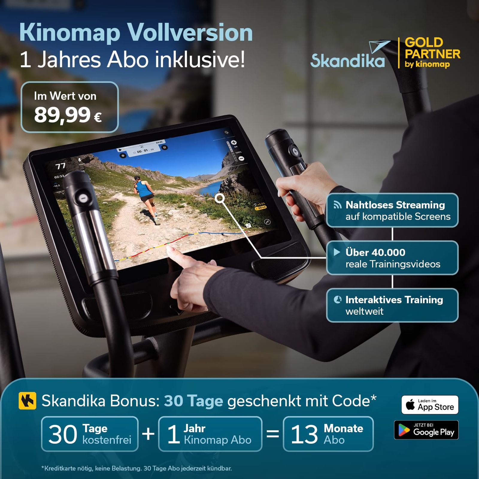 Die im Bordcomputer integrierte Fitness-App Kinomap ermöglicht die Nutzung individueller Trainingsprogramme. Dieses Bundle beinhaltet ein Jahresabo für Kinomap im Wert von 89.99€ und zusätzlich einen Code, um die Vollversion der App weitere 30 Tage kostenfrei zu testen – für insgesamt 13 Monate Live-Videos, Coachings und virtuelle Trainingsvideos.