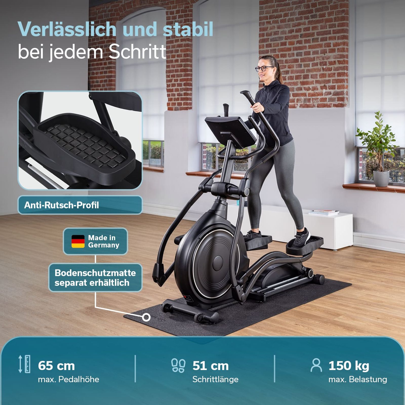 - Pulssensoren an den Handgriffen, große Pedale, Trinkflaschenhalterung, Tablet-Halterung