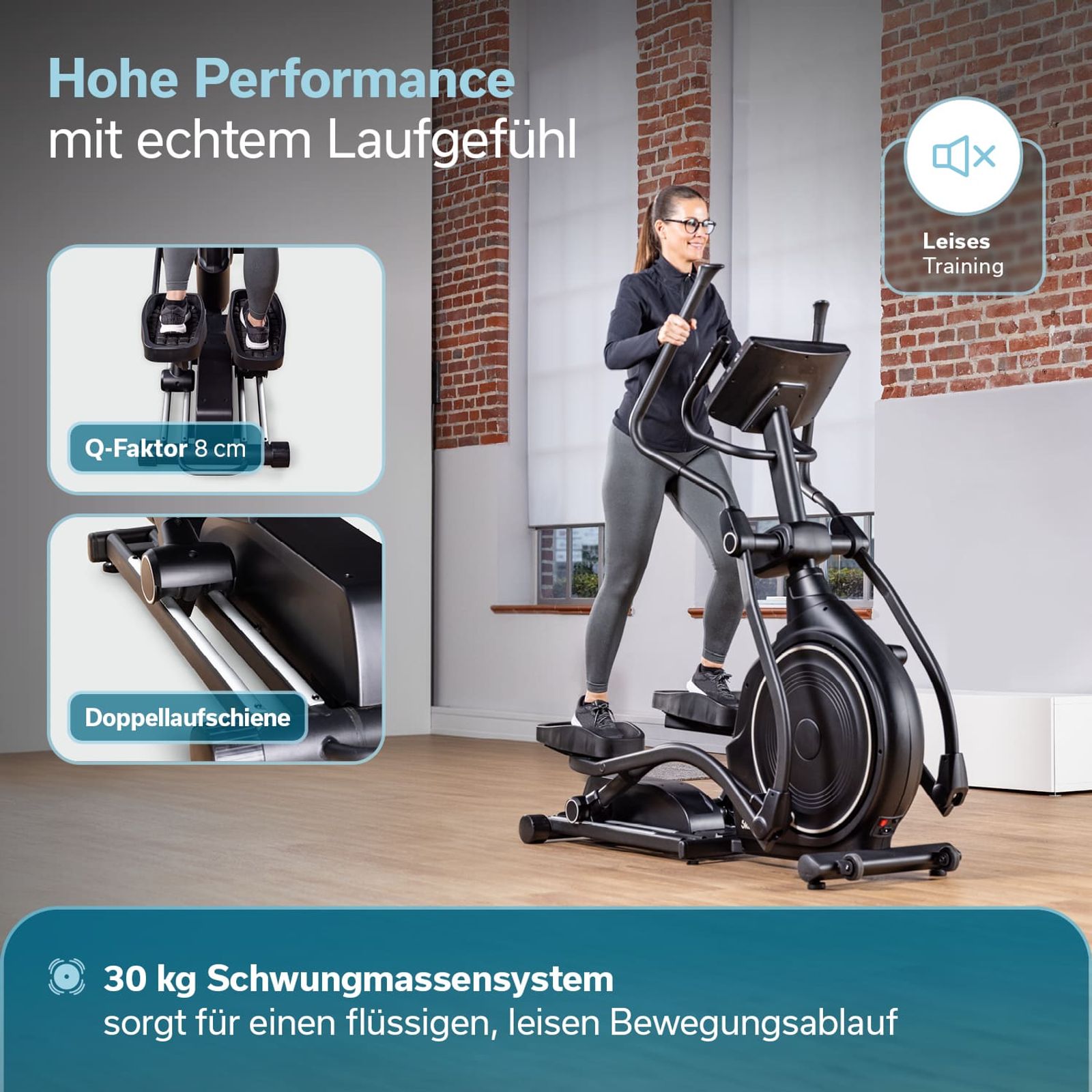 - Natürlicher Laufstil mit einem Doppelschienensystem und geringem Q-Faktor von 8 cm