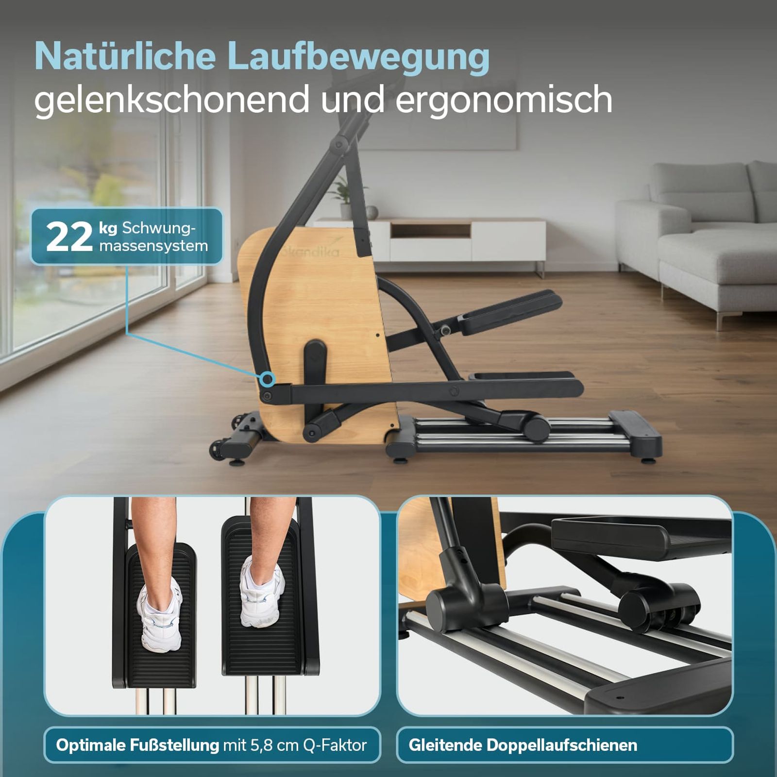 Durch das 22 kg schwere Schwungmassensystem und das vorne platzierte Schwungrad wird eine flüssige und angenehme Bewegung ermöglicht, die dem Nordic Walking ähnelt.