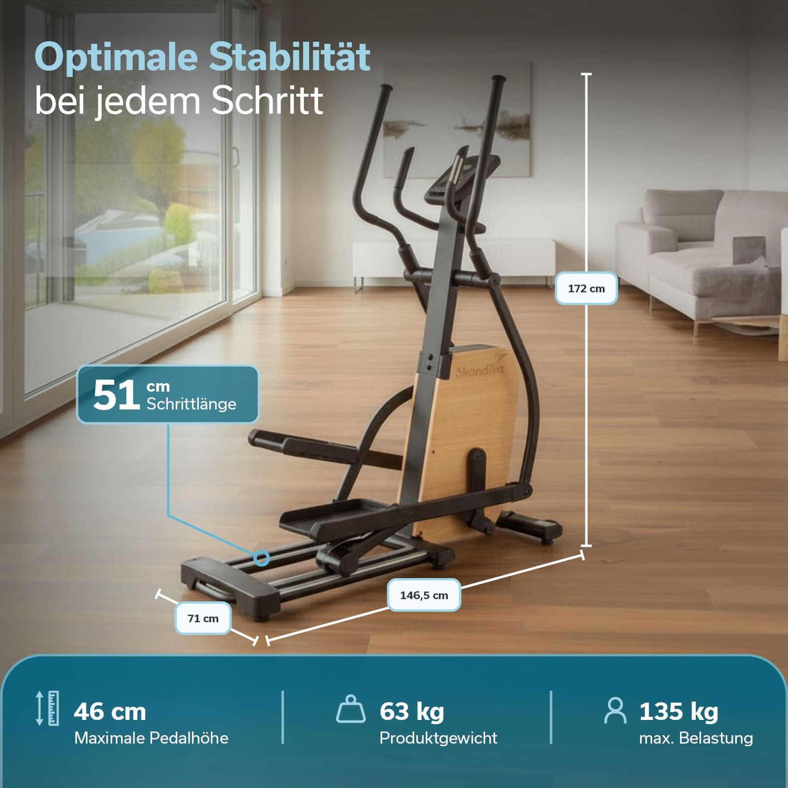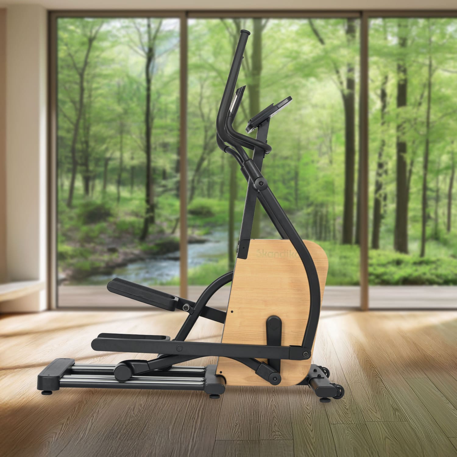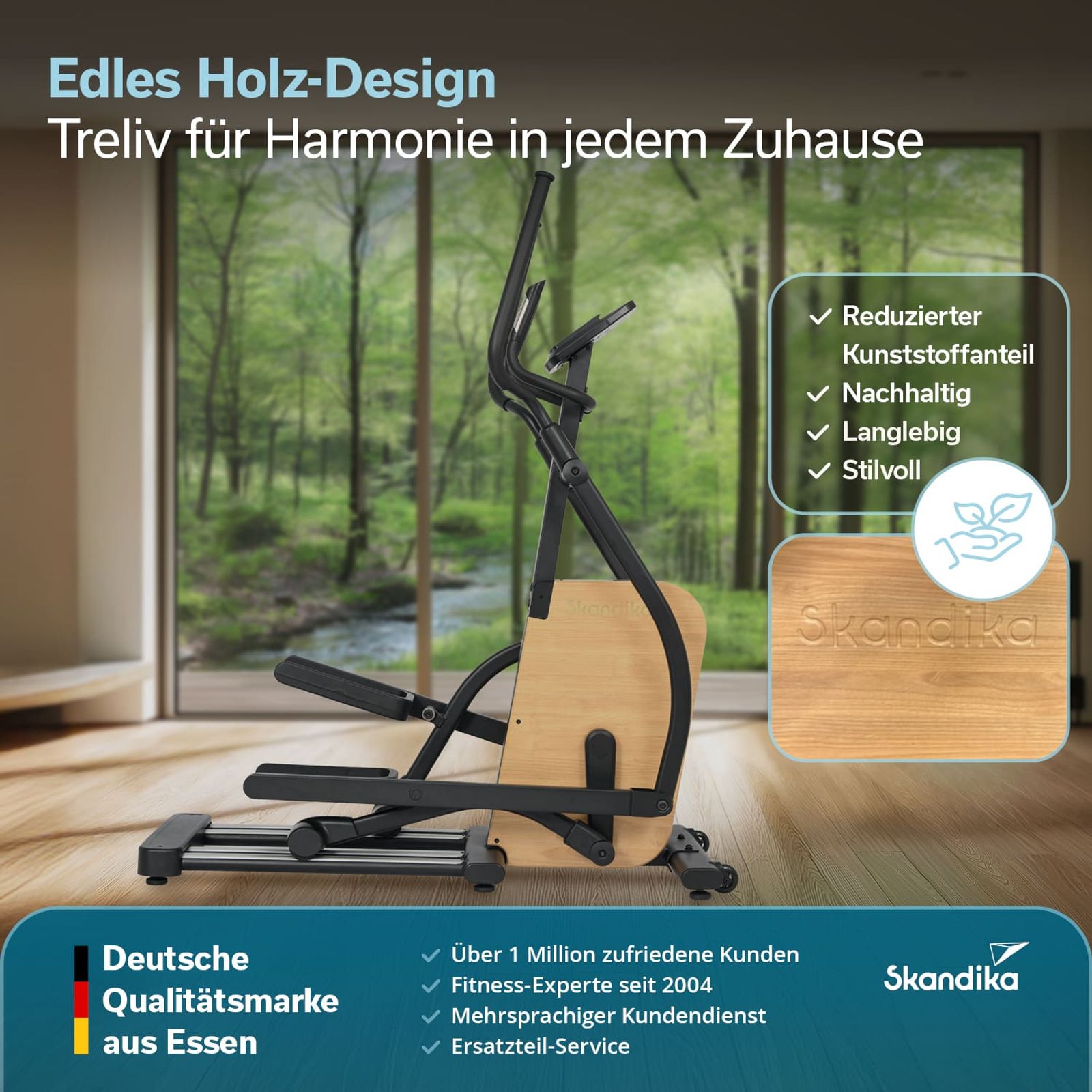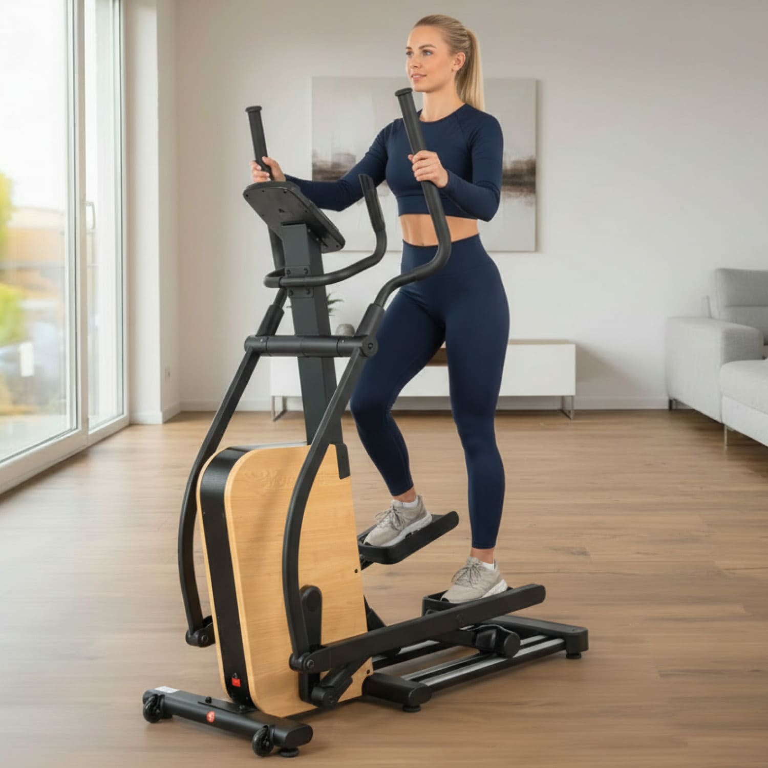 - Leistungsstarker Crosstrainer aus robustem Eisen mit stilvollen Echtholz-Elementen