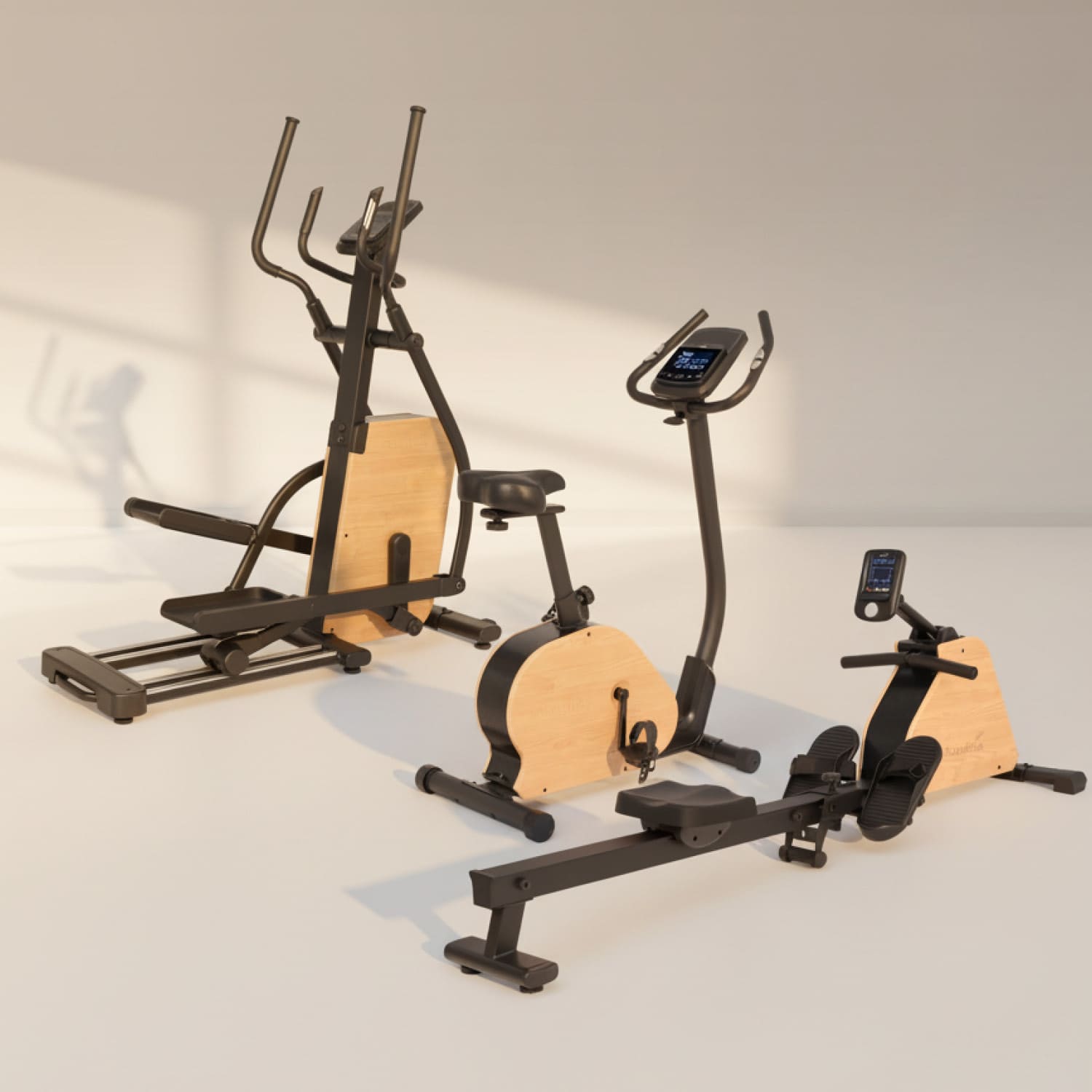 Mit ihrem eleganten Design aus schwarzem Eisen und Echtholz-Elementen kombinieren die stilvollen Treliv-Fitnessgeräte moderne Funktionalität mit naturnaher Ästhetik.