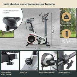 Die stabile Konstruktion des Ergometers besteht aus hochwertigem Stahl und Aluminium und trägt dabei Sportler mit bis zu 150 kg Körpergewicht. Mit seinem 103 × 56 × 144 cm bleibt der Heimtrainer kompakt genug für das Wohnzimmer, ermöglicht aber eine maximale Benutzergröße von 200 cm.