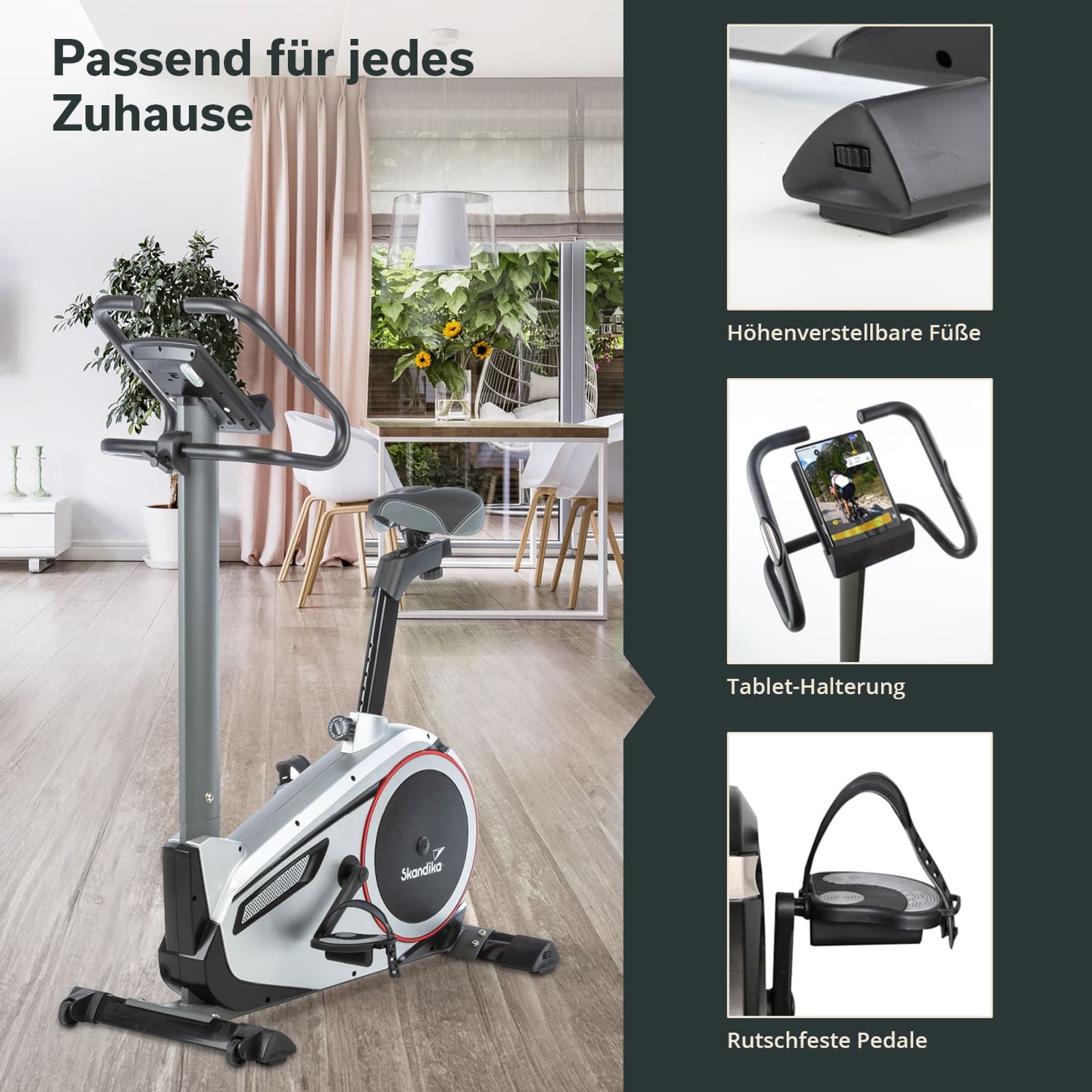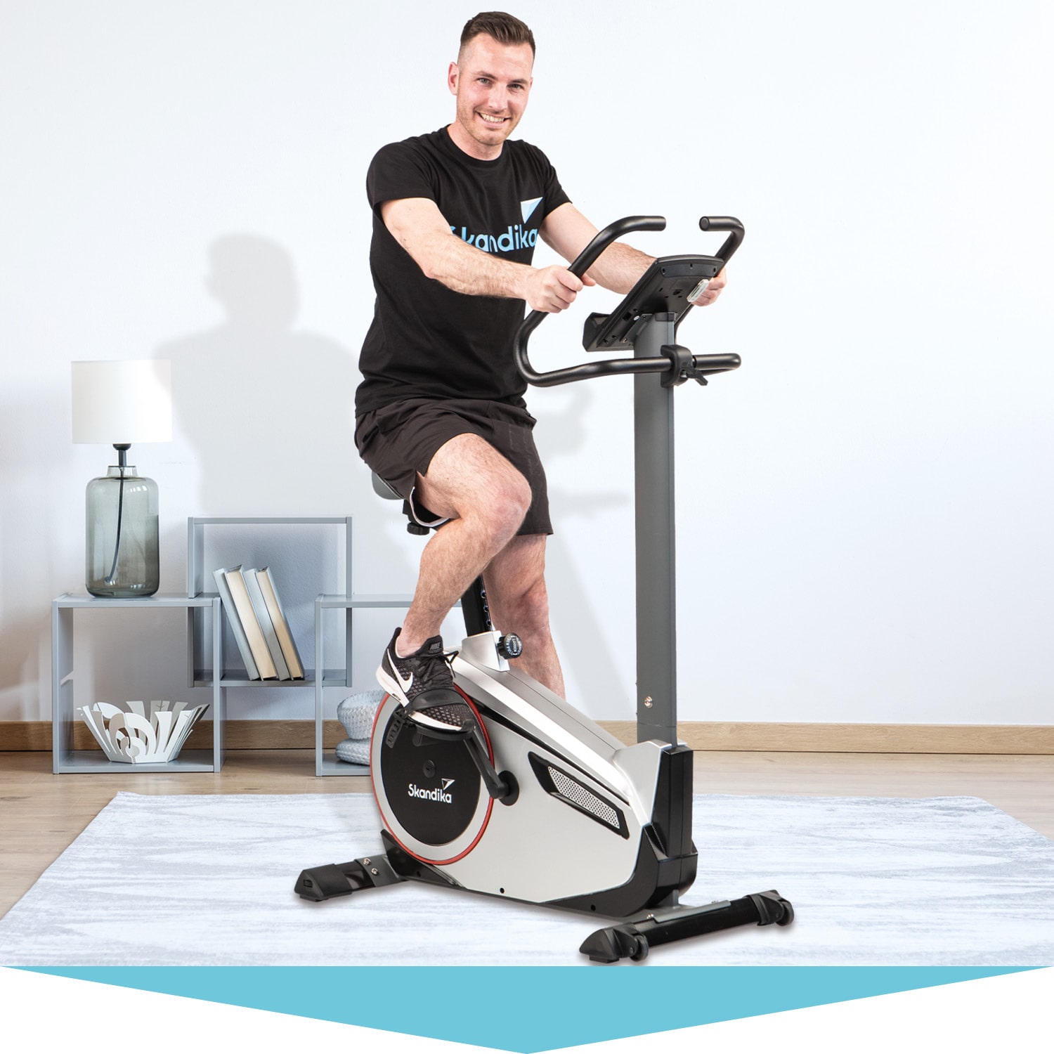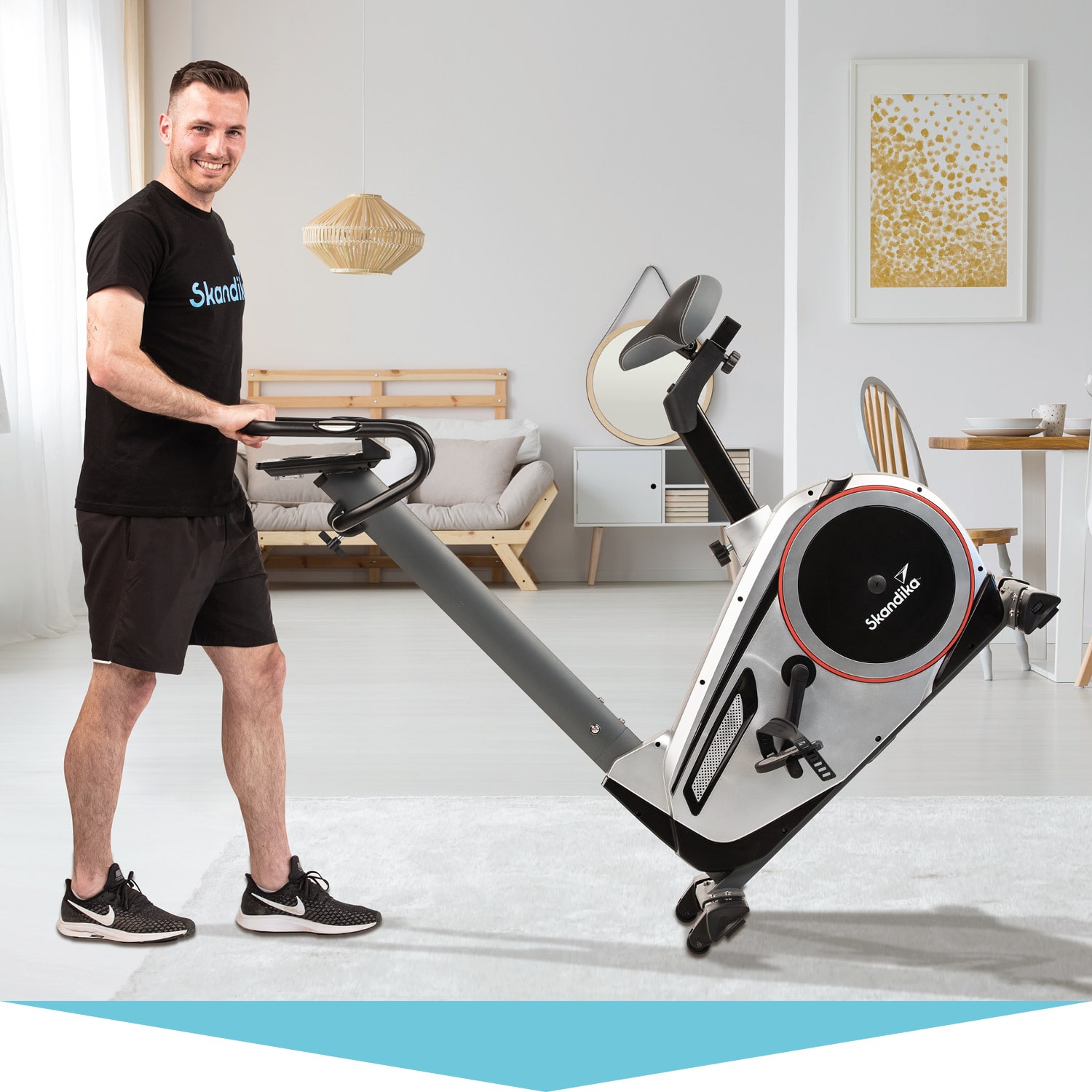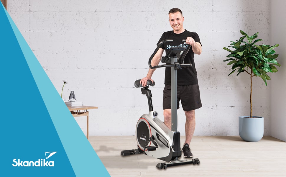 - Bequemer, gepolsterter Sattel, Pulssensoren im Lenker, Transportrollen, Skandika Brustgurt