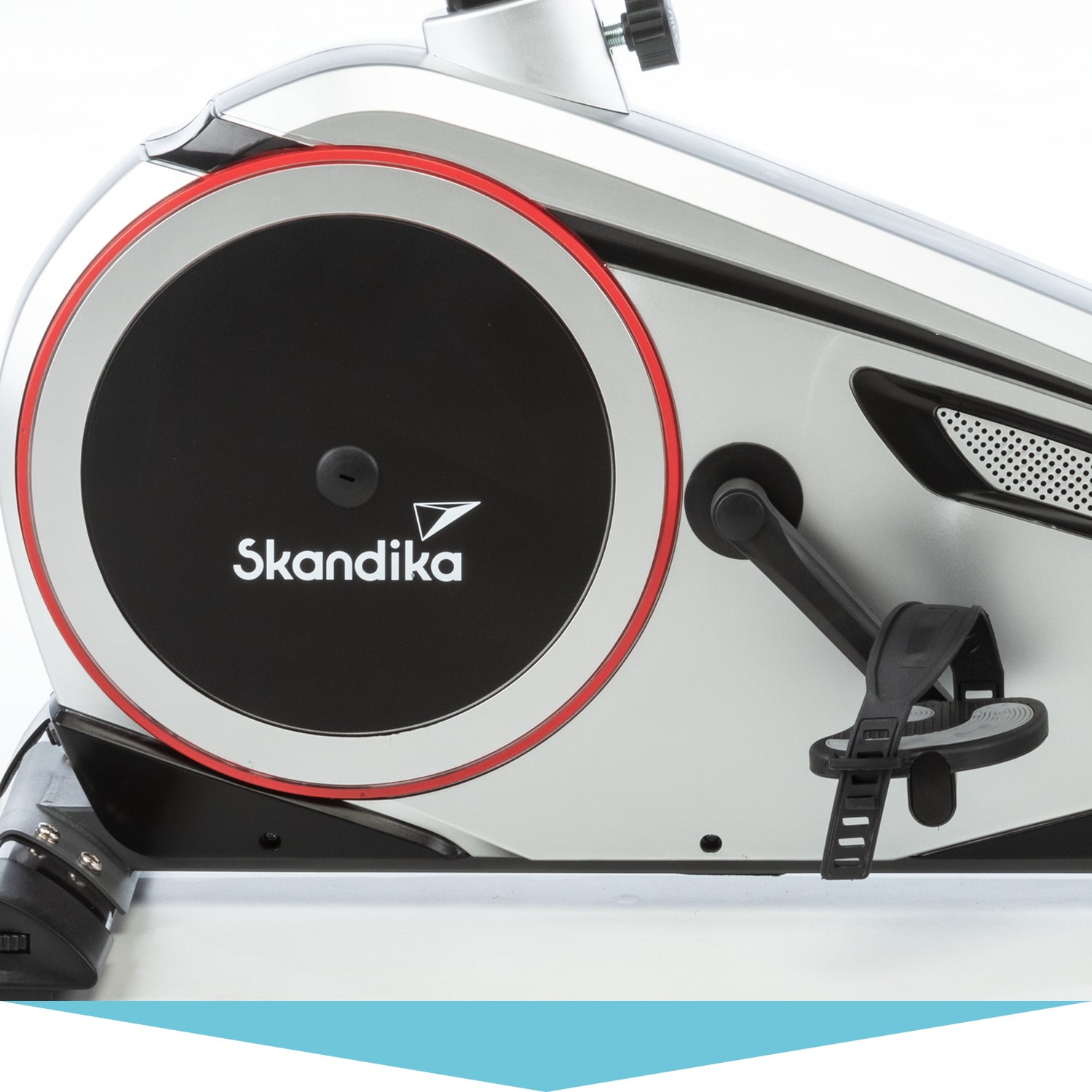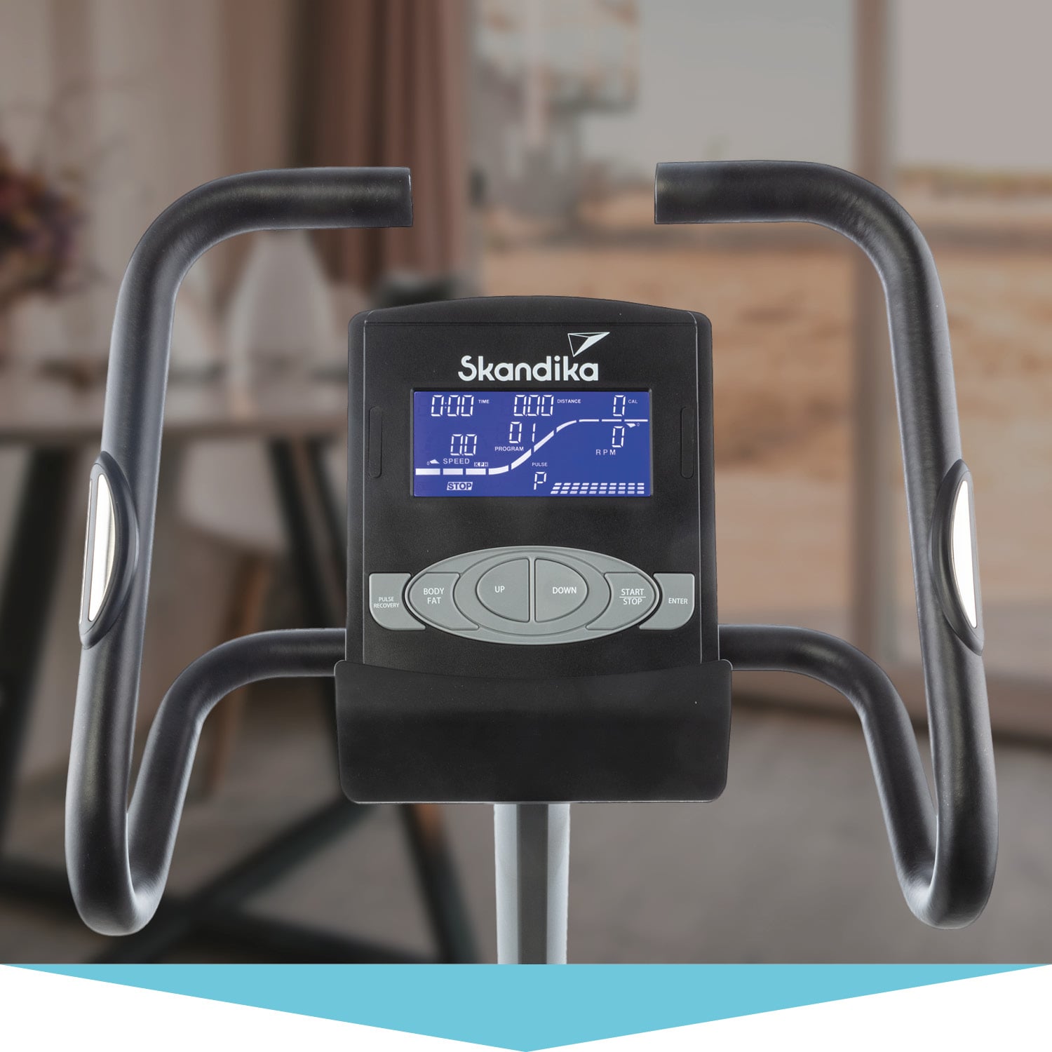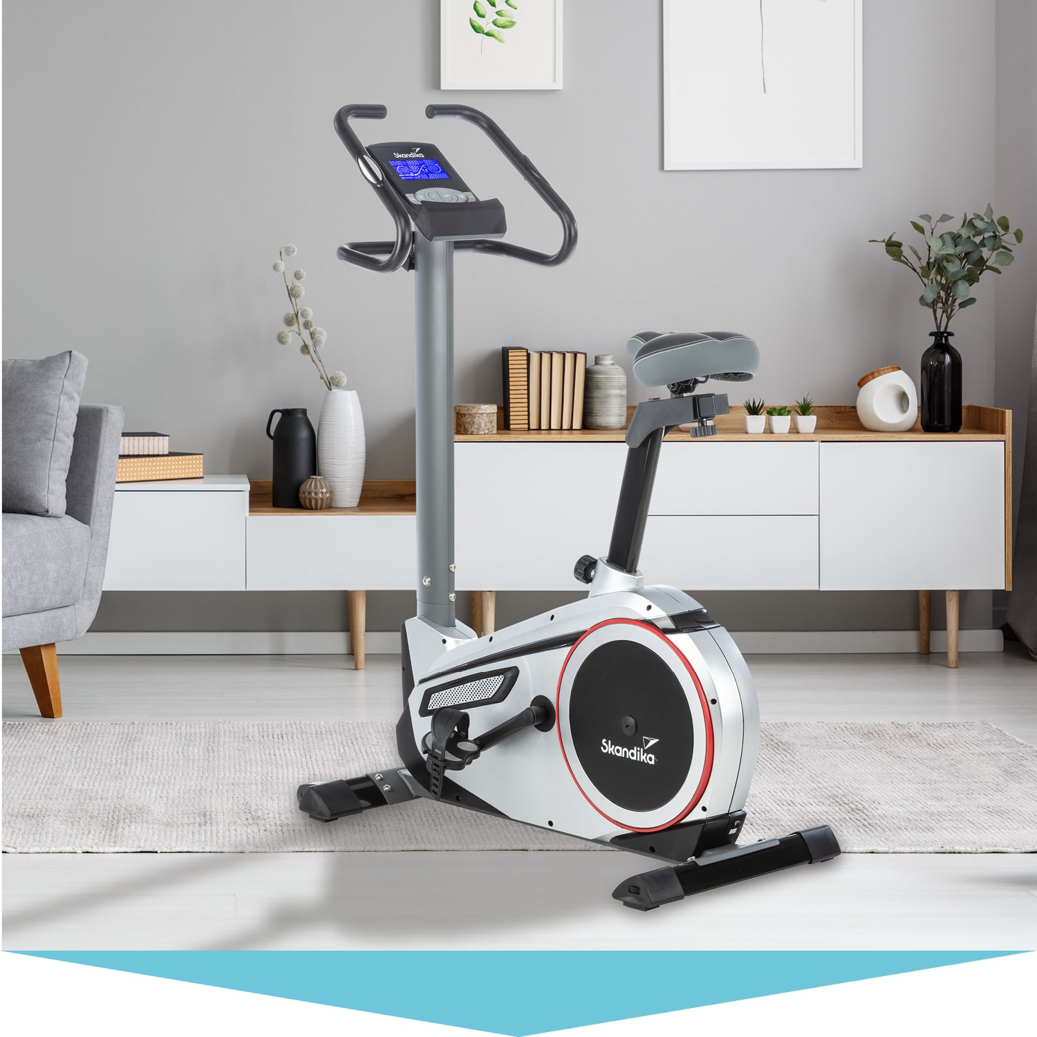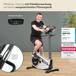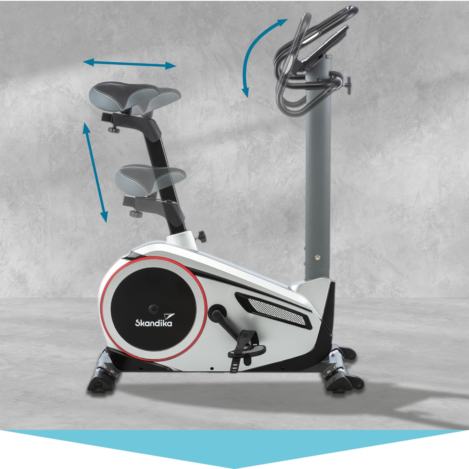 - Bequemer, gepolsterter Sattel, Pulssensoren im Lenker, Transportrollen, Skandika Brustgurt