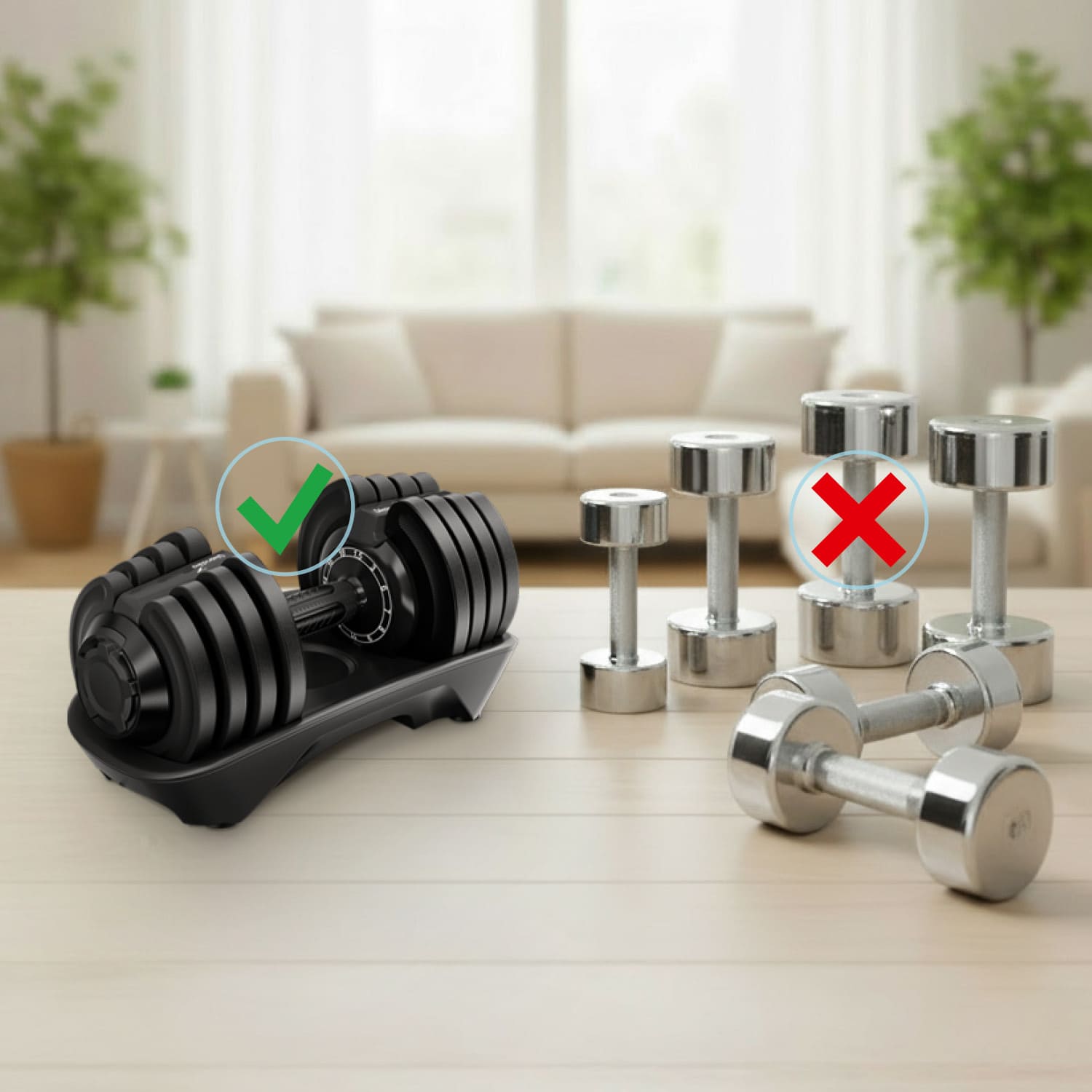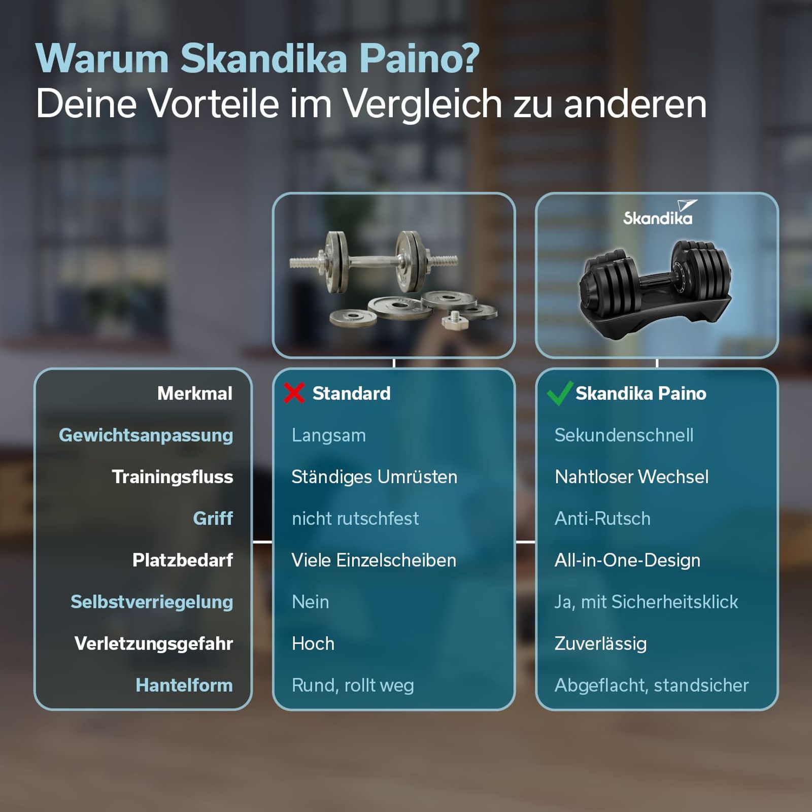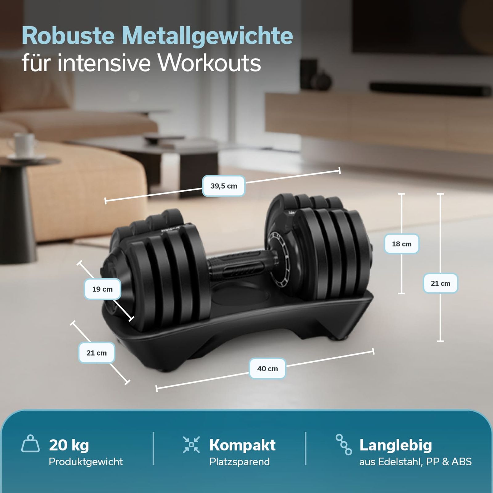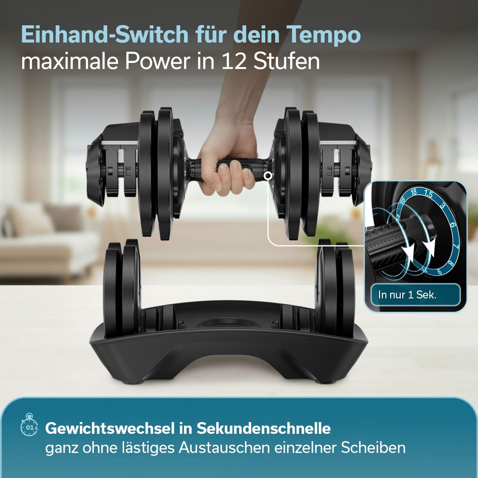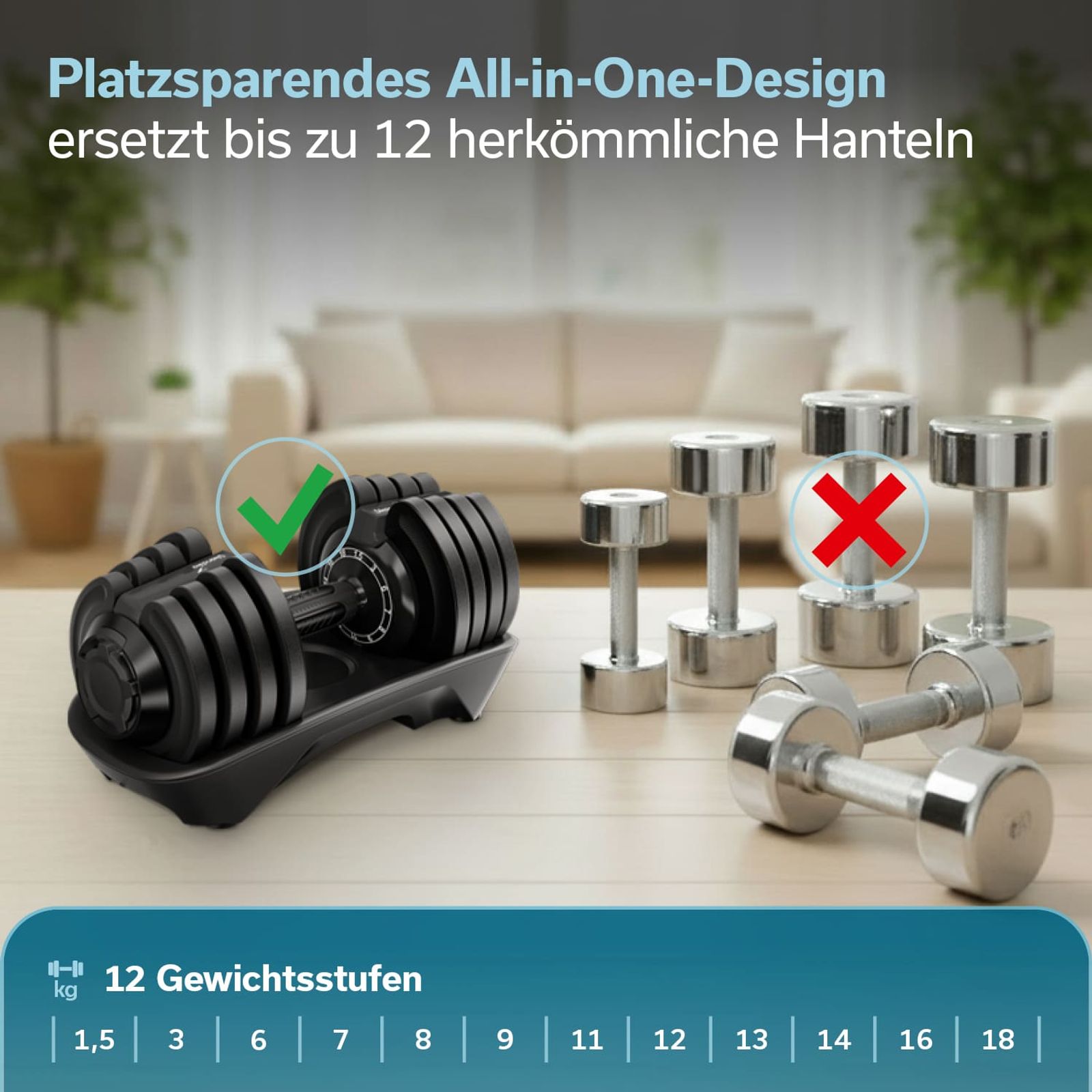 - Platzsparendes All-in-One-Design ersetzt zwölf separate Hanteln und spart wertvollen Trainingsplatz