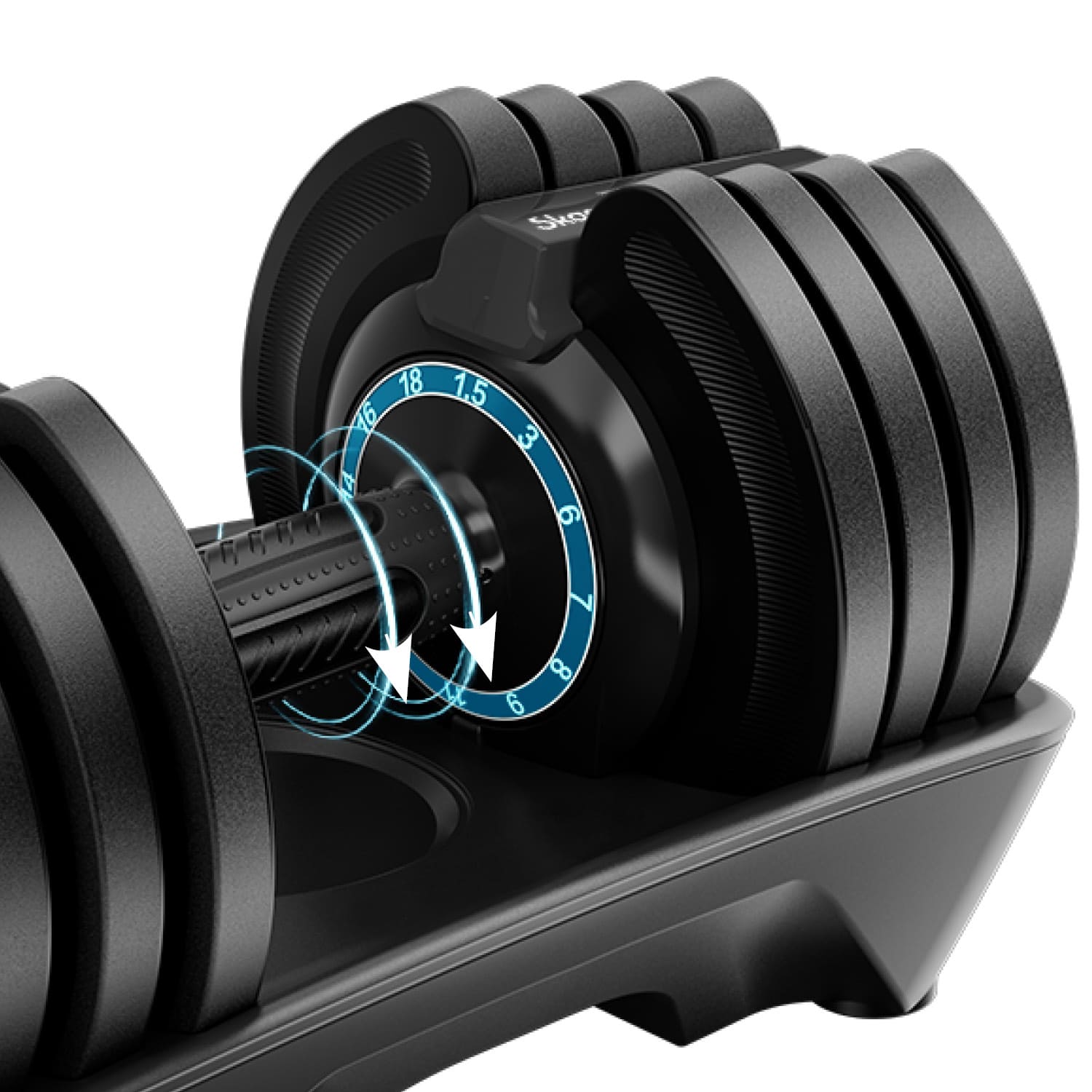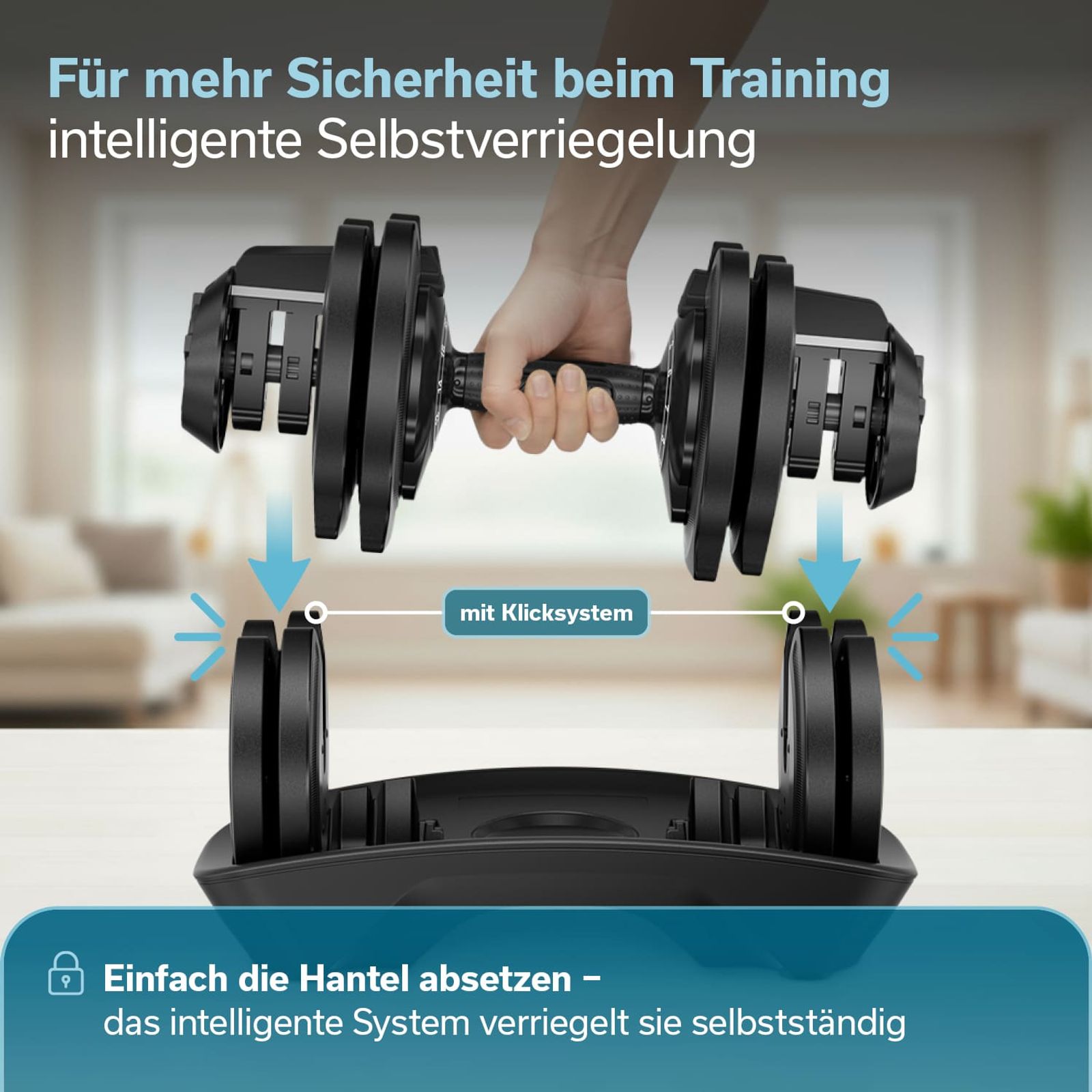 Das innovative Selbstverriegelungssystem ermöglicht einen Gewichtswechsel in Sekundenschnelle. Einfach die Hantel auf die Ablage positionieren, am Drehgriff das gewünschte Gewicht einstellen und die entsprechenden Scheiben rasten automatisch ein.