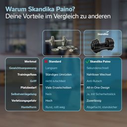 Mit der Skandika Paino zieht eine verstellbare Hantel ins Heimstudio ein, die mit ihrem innovativen Schnellwechselsystem und platzsparenden All-in-One-Design überzeugt. Sie vereint zwölf Gewichtsstufen von 1,5 bis 18,0 kg in einem einzigen kompakten Trainingsgerät und ermöglicht so zahlreiche Übungen sowohl für Einsteiger als auch für Fortgeschrittene. Das intelligente Selbstverriegelungssystem macht den Gewichtswechsel zum Kinderspiel und sorgt für effektive Workouts ohne unnötige Unterbrechungen.