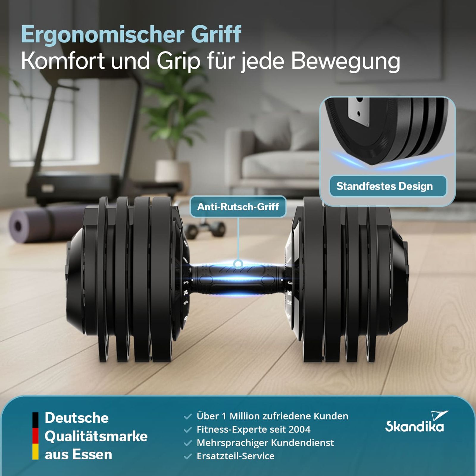 Mit der Skandika Paino zieht eine verstellbare Hantel ins Heimstudio ein, die mit ihrem innovativen Schnellwechselsystem und platzsparenden All-in-One-Design überzeugt. Sie vereint zwölf Gewichtsstufen von 3 bis 24,0 kg in einem einzigen kompakten Trainingsgerät und ermöglicht so zahlreiche Übungen sowohl für Einsteiger als auch für Fortgeschrittene. Das intelligente Selbstverriegelungssystem macht den Gewichtswechsel zum Kinderspiel und sorgt für effektive Workouts ohne unnötige Unterbrechungen.