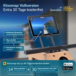 Skandika-Kunden profitieren von der Gold-Partnerschaft mit Kinomap und erhalten einen Code für 30 Tage kostenfreie Vollversion der App. Live-Videos, Coachings und virtuelle Trainingsvideos bringen jede Trainingseinheit auf ein neues Level und ermöglichen Workouts an den schönsten Orten der Welt. Kinomap passt den Widerstand automatisch an für ein authentisches Rudergefühl.