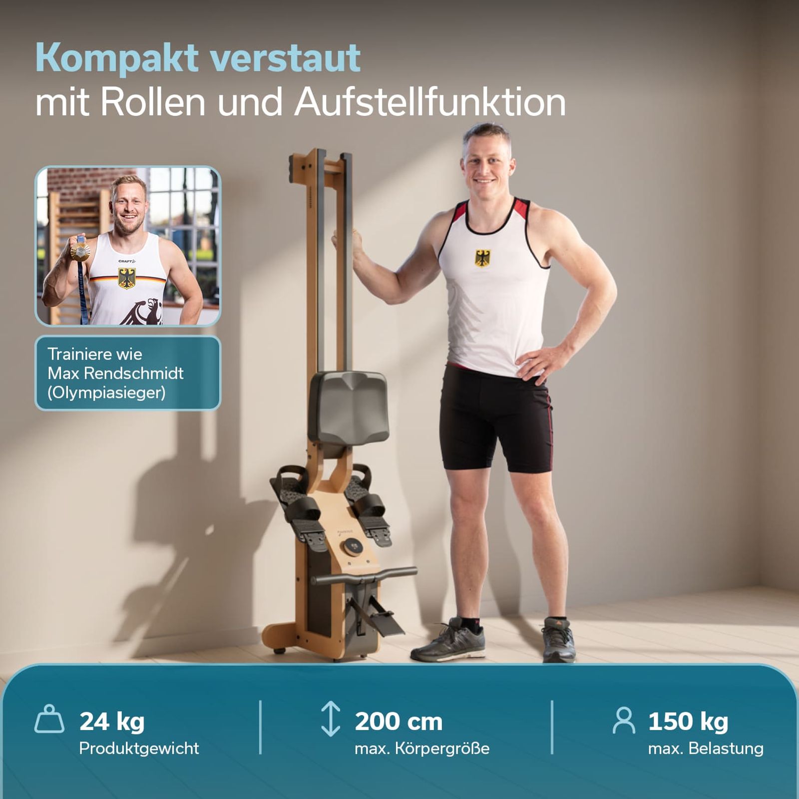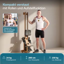 Mit nur 24 kg Nettogewicht bleibt das Rudergerät aus massivem Buchenholz erstaunlich leicht und gut handhabbar. Transportrollen ermöglichen müheloses Verschieben, während die platzsparende Aufstellfunktion wertvollen Wohnraum spart. Diese Kombination macht das Torin P6-G besonders für kleinere Wohnungen und flexible Trainingsumgebungen attraktiv.