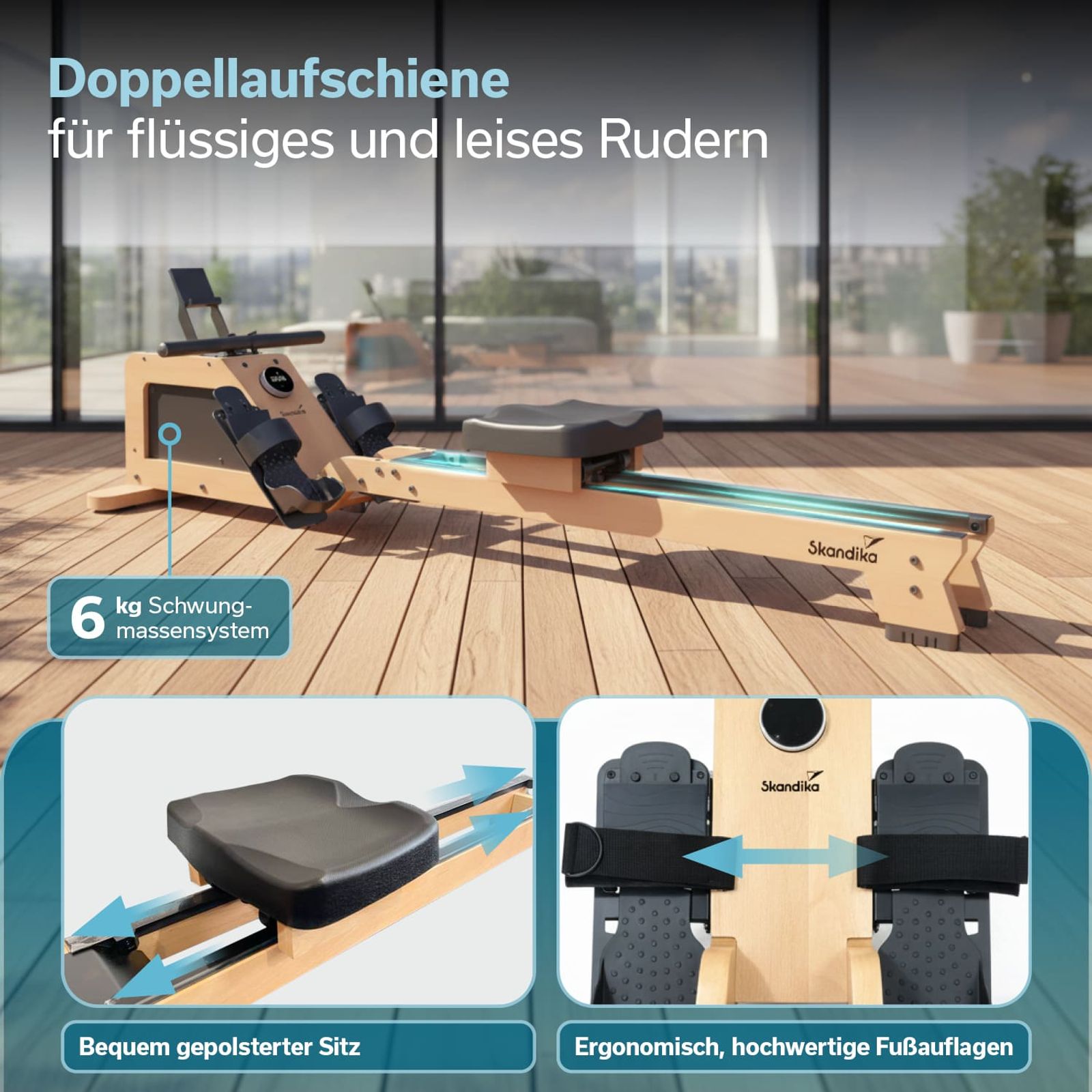 Das Skandika Torin P6-G verbindet modernste Technologie mit natürlicher Ästhetik und setzt neue Maßstäbe für das Training zu Hause. Das Rudergerät aus massivem Buchenholz überzeugt durch seine selbstgenerierende Energieversorgung, die vollkommen unabhängig von einer Steckdose auskommt. Die innovative Doppellaufschiene sorgt für flüssige Bewegungsabläufe und maximale Stabilität, und doch bleibt das Trainingsgerät erstaunlich leicht und kompakt. Mit der vertikalen Aufstellfunktion ist es besonders für kleinere Wohnungen attraktiv, und die zeitlose Designkombination aus heller Buche und schwarzen Komponenten bringt Eleganz in jede Wohnumgebung.