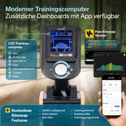 - Pulsmessung per 5,3 kHz Brustgurt (separate erhältlich) oder per Bluetooth über Kinomap App