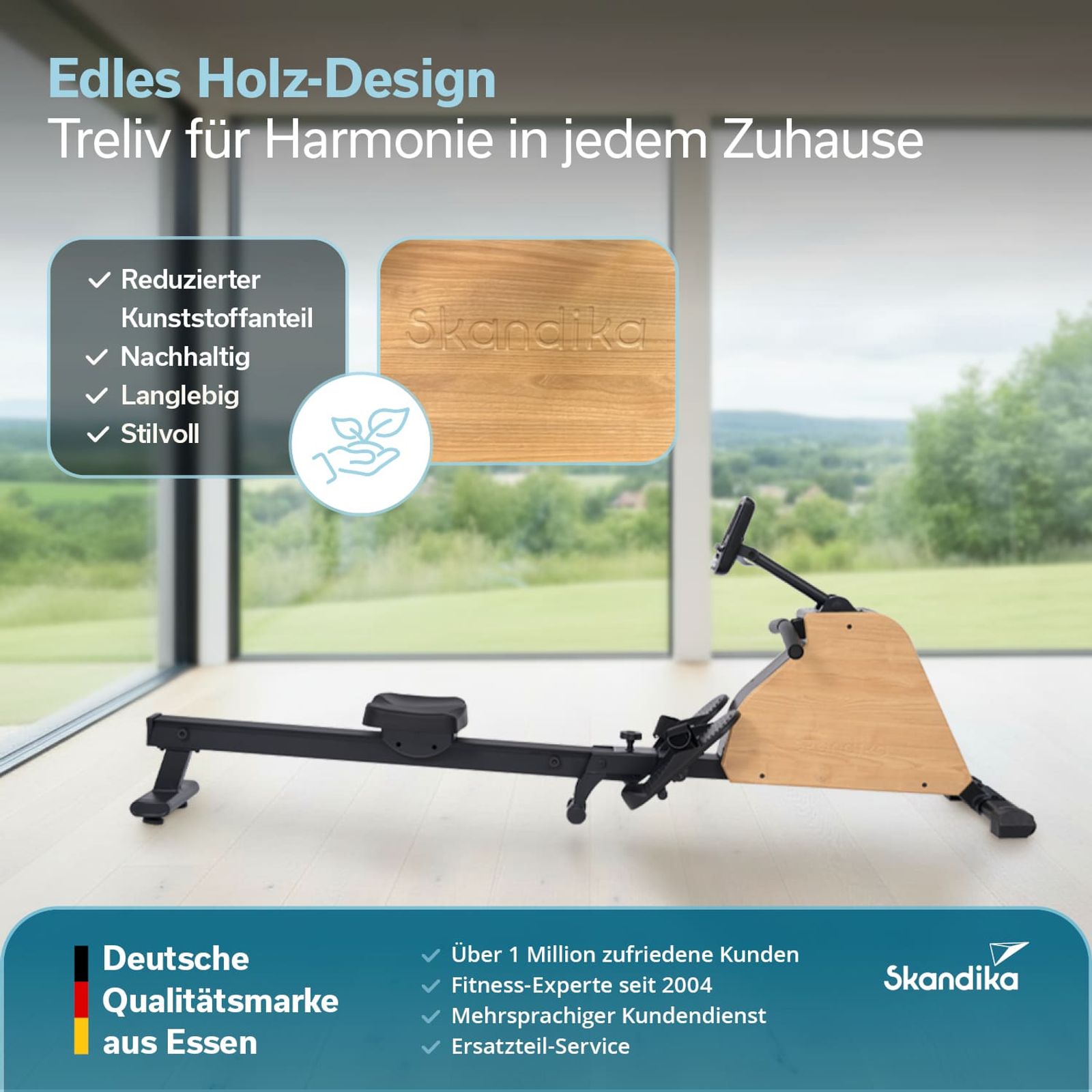 Das klappbare Rudergerät Treliv P6 ist Teil unserer neuen Skandika Treliv-Produktreihe, die mehrere unterschiedliche Trainingsgeräte im gleichen Stil vereint. Typisch für die hochwertige Treliv-Reihe vereint auch das Treliv P6 Rudergerät die hohe Stabilität eines Eisenrahmens mit einem eleganten schwarzen Look. Hochwertige Echtholz-Elemente mit edler Skandika-Prägung verleihen dem Gerät zudem seinen unverwechselbaren Charakter. Es ist die ideale Wahl für alle, die effektiv und komfortabel in den eigenen vier Wänden trainieren wollen.