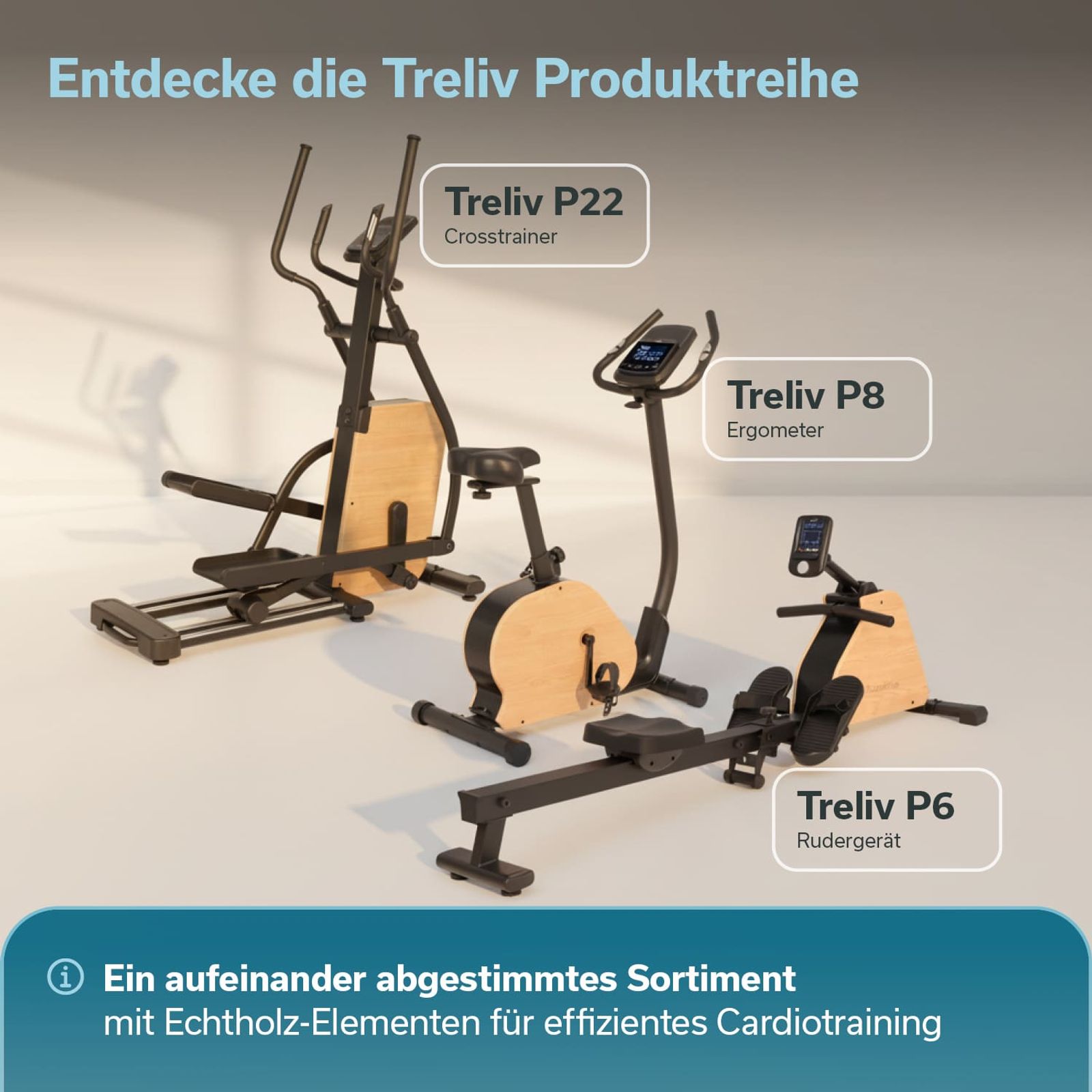 Mit ihrem eleganten Design aus schwarzem Eisen und Echtholz-Elementen kombinieren die stilvollen Treliv-Fitnessgeräte moderne Funktionalität mit naturnaher Ästhetik.