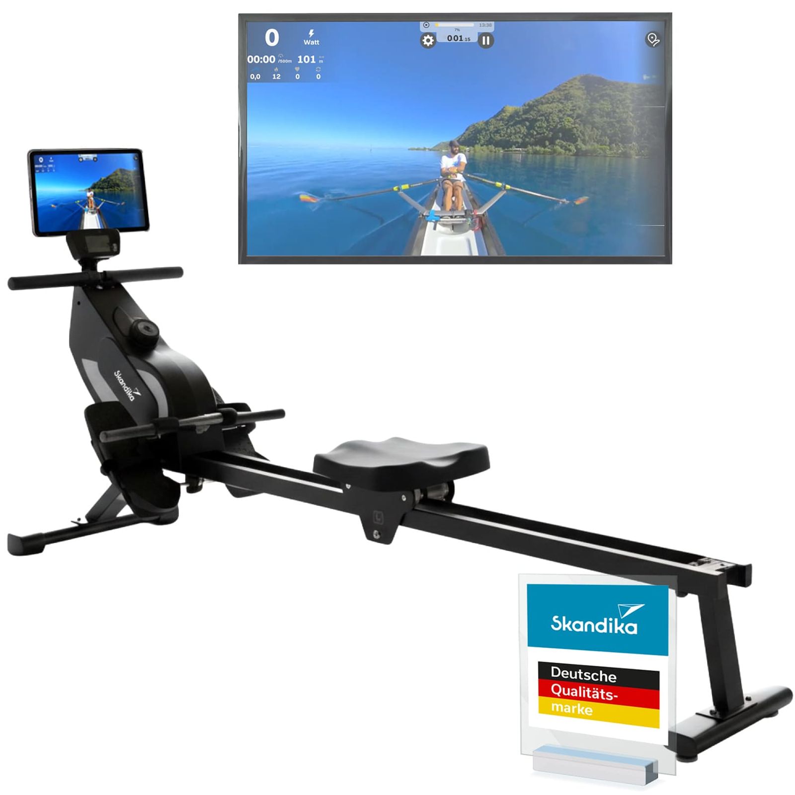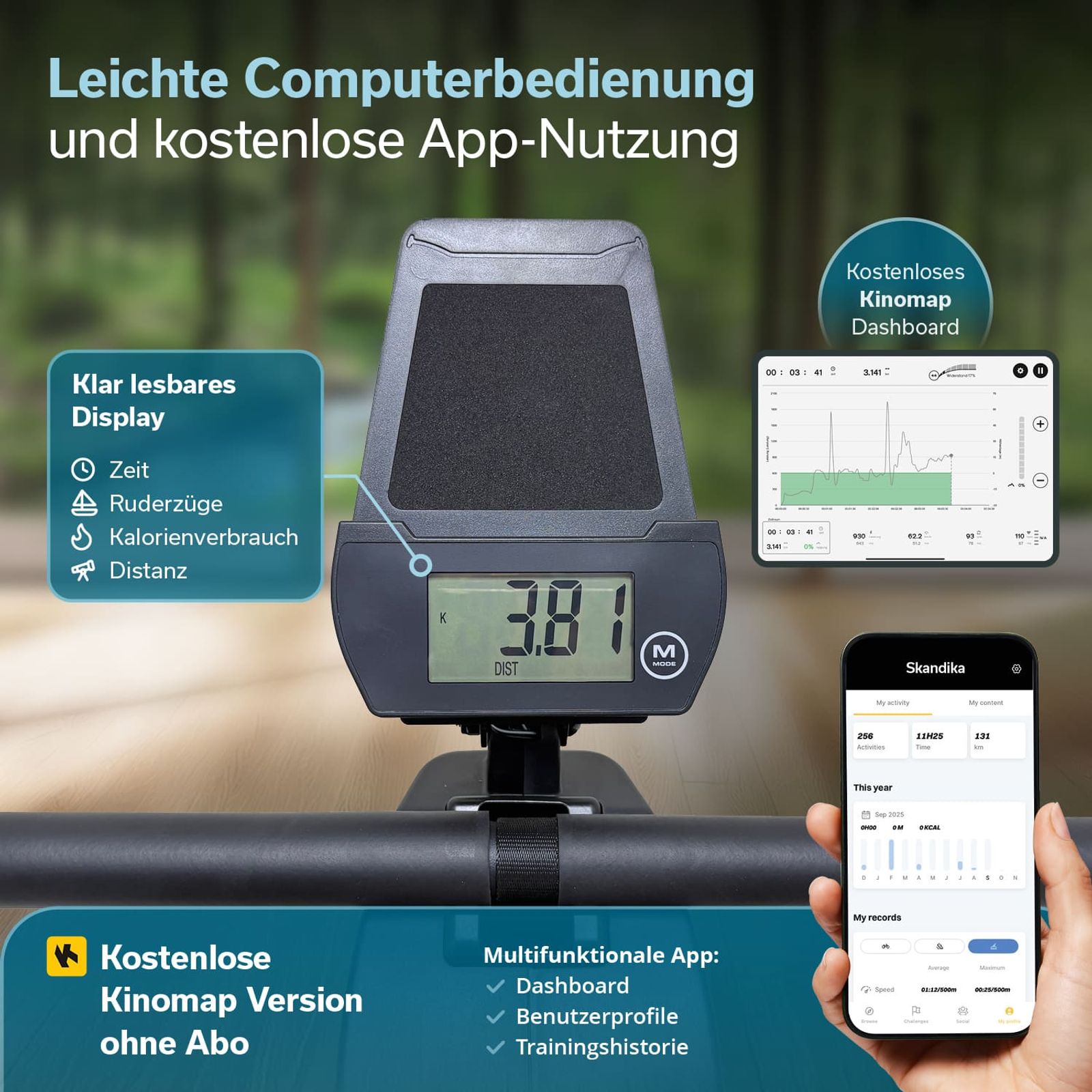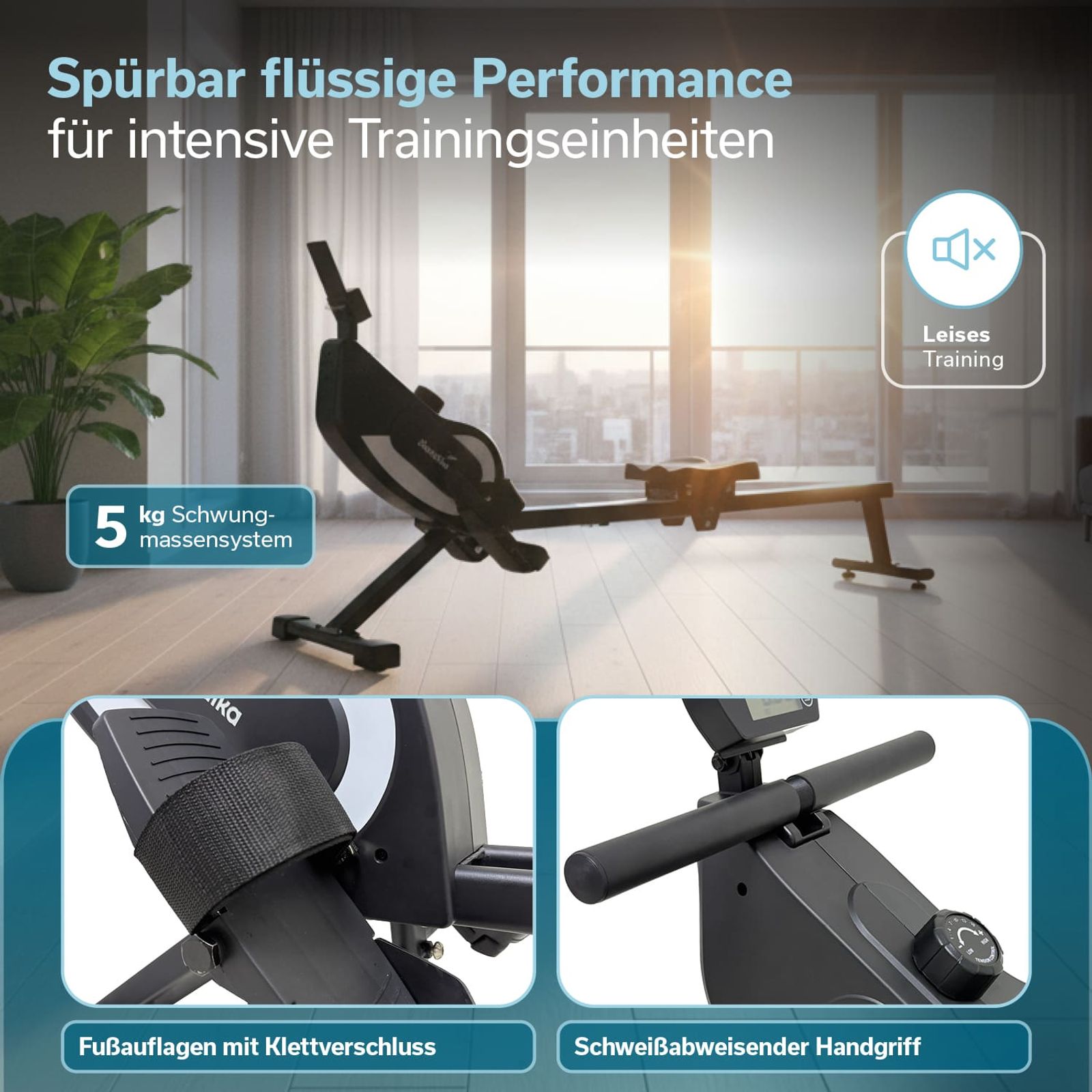 - Modernes Rudergerät mit extra langer Laufschiene für komfortables Training zuhause