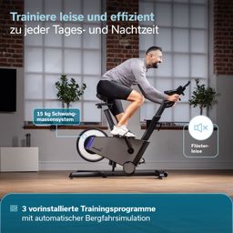 Integrierte Schnellbedienungstasten im Lenker ermöglichen das Anpassen von Widerstand und Neigung ohne Positionswechsel. Über drei vorinstallierte Programme mit variierenden Belastungsprofilen wird das Training vollautomatisch: Widerstand und Steigung passen sich in Echtzeit an für ein authentisches Fahrgefühl beim strukturierten Intervalltraining.