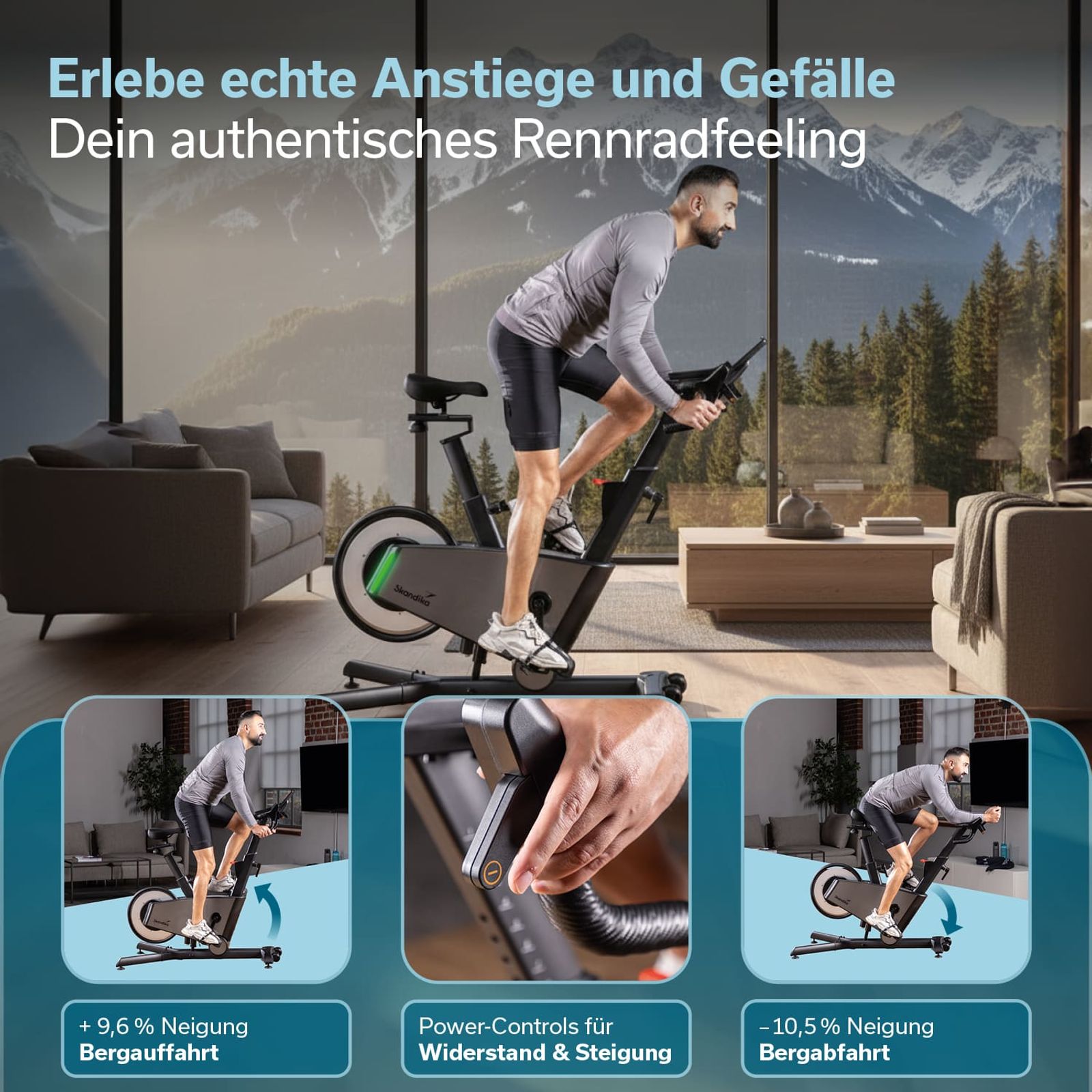 - Motorisierte Steigungsfunktion mit 16 Stufen von -10,5 % bis + 9,6 % für authentisches Rennrad-Feeling