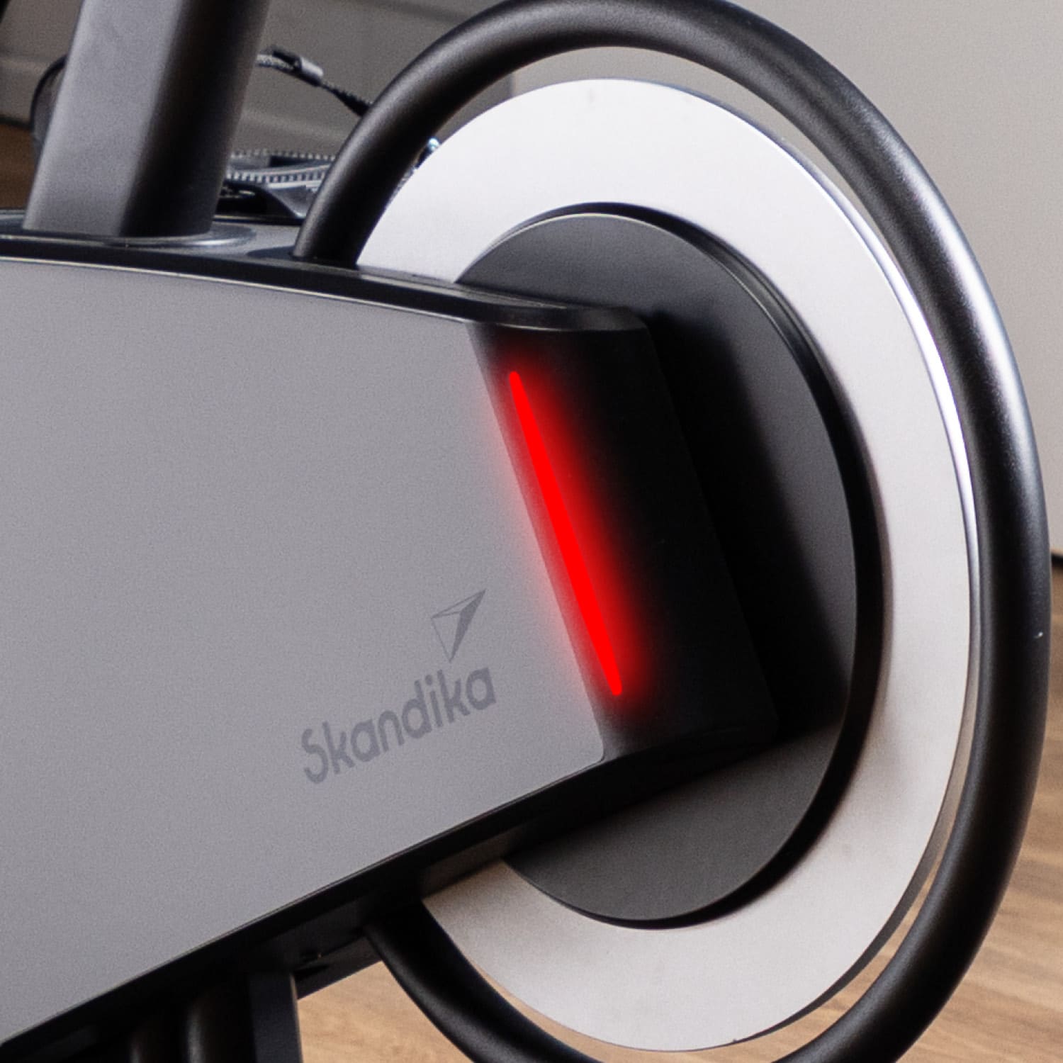 Die elektrische Magnetbremse mit 32 computergesteuerten Widerstandsstufen mit LED-Anzeige in rot, blau und grün ermöglicht eine präzise Trainingssteuerung für jedes Fitnesslevel. Die dezente Beleuchtung am Gehäuse wechselt entsprechend der Trainingsintensität ihre Farbe und unterstreicht den modernen Charakter des Speedbikes.