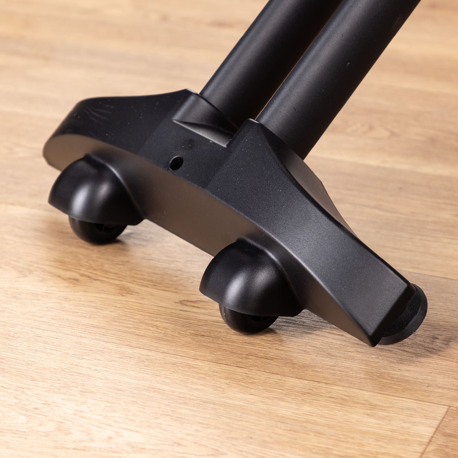 Der stabile Stahlrahmen ist für Trainierende mit einem Körpergewicht bis zu 150 kg geeignet und bietet mit justierbaren Nivellierfüßen einen perfekten Stand auf jedem Untergrund. Transportrollen am vorderen Standfuß ermöglichen einen einfachen und komfortablen Platzwechsel des Speedbikes nach dem Training.