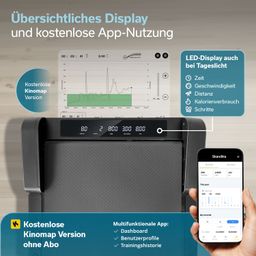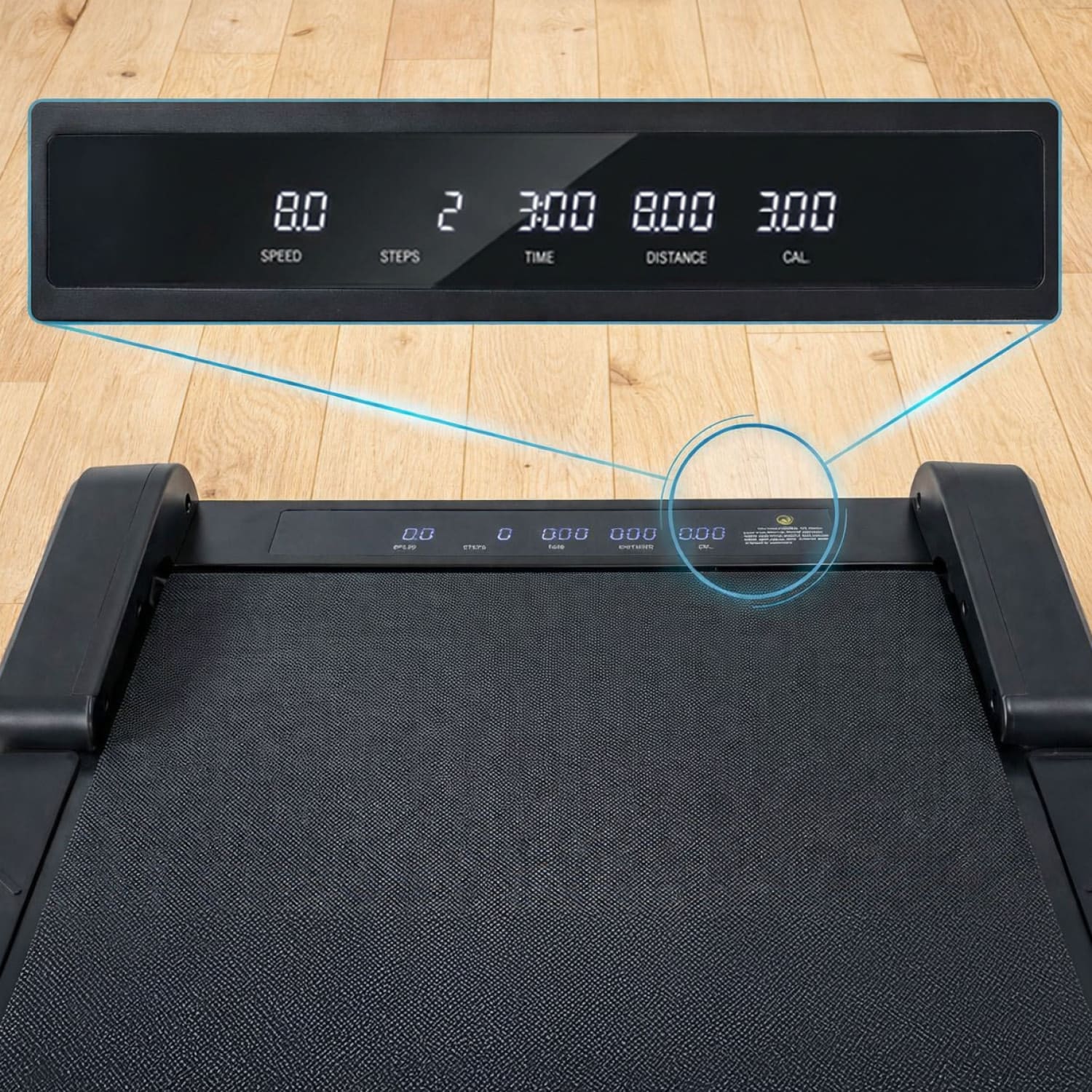 Im vorderen Bereich des Walking Pads zeigt ein gut ablesbares LED-Display während des Trainings alle wichtigen Informationen an: Zeit, Kalorien, Distanz, Geschwindigkeit, Schrittzahl und Bluetooth-Verbindung. So bleibt der Trainingsfortschritt jederzeit nachvollziehbar und die Motivation hoch.