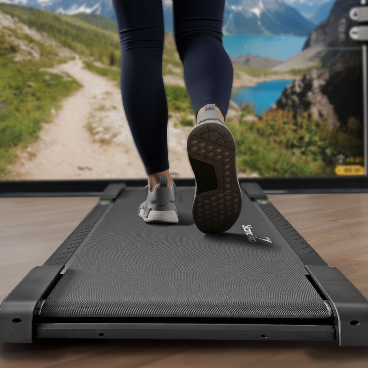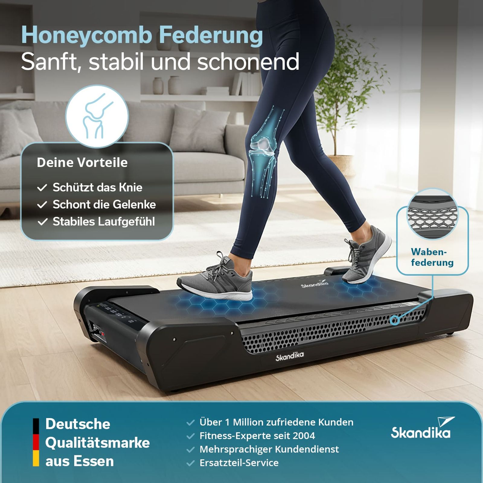 Unter der rutschfesten Lauffläche befindet sich ein durchgehendes Dämpfungssystem mit wabenförmigen Elastomeren. Diese innovative Technologie verringert Vibrationen, federt jeden Schritt ab und schont Rücken-, Knie- und Hüftgelenke. Das Training wird dadurch nicht nur komfortabler, sondern auch deutlich leiser – ideal für Wohnungen mit Nachbarn oder Büroumgebungen.