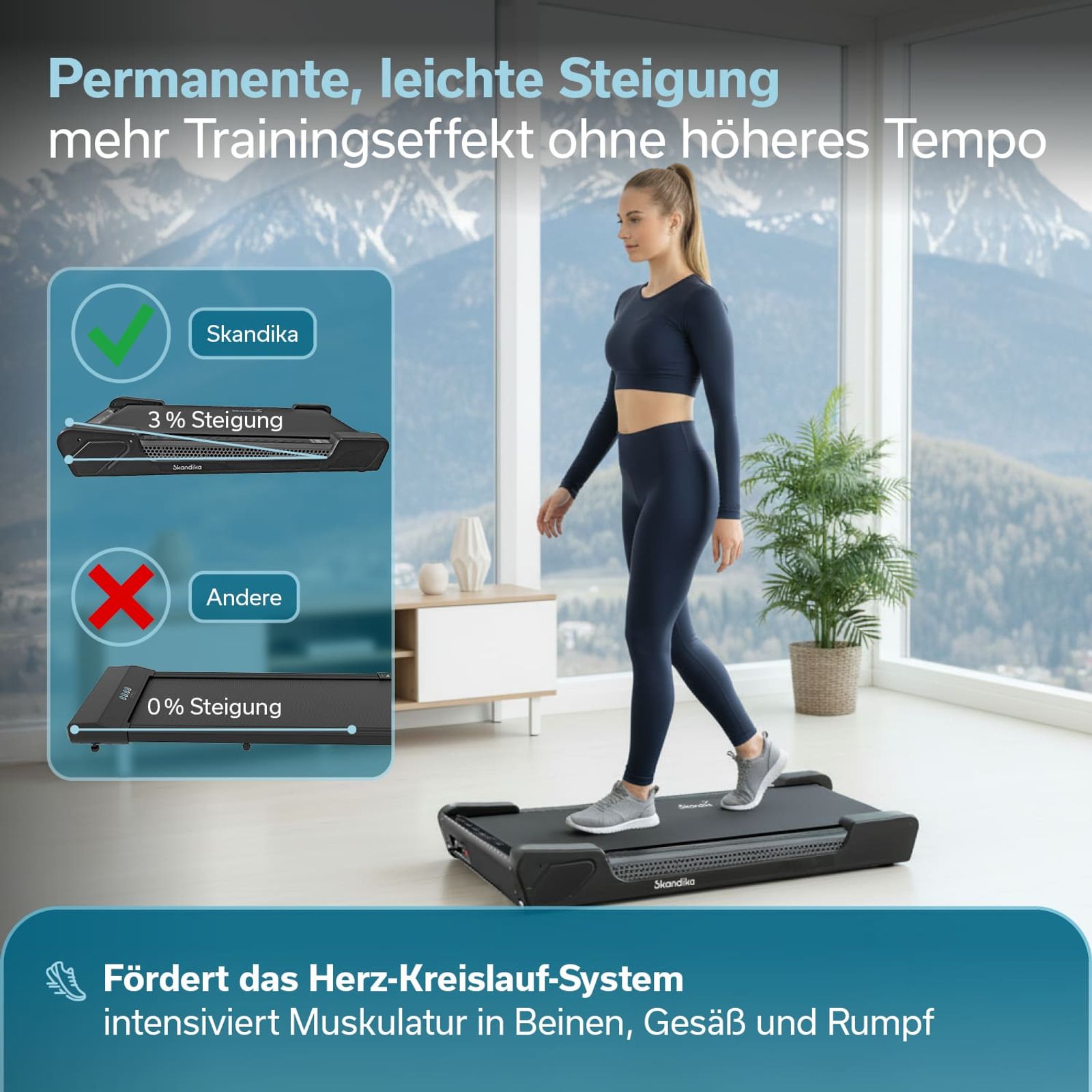 Die fest integrierte Steigung von 3 % macht jede Geheinheit automatisch effektiver. Das Herz-Kreislauf-System wird stärker gefordert, während Muskulatur in Beinen, Gesäß und Rumpf intensiver arbeitet. Bereits beim gemütlichen Gehen werden etwa 15 bis 25 % mehr Kalorien verbrannt als auf einer flachen Fläche, ohne dass das Tempo erhöht werden muss.