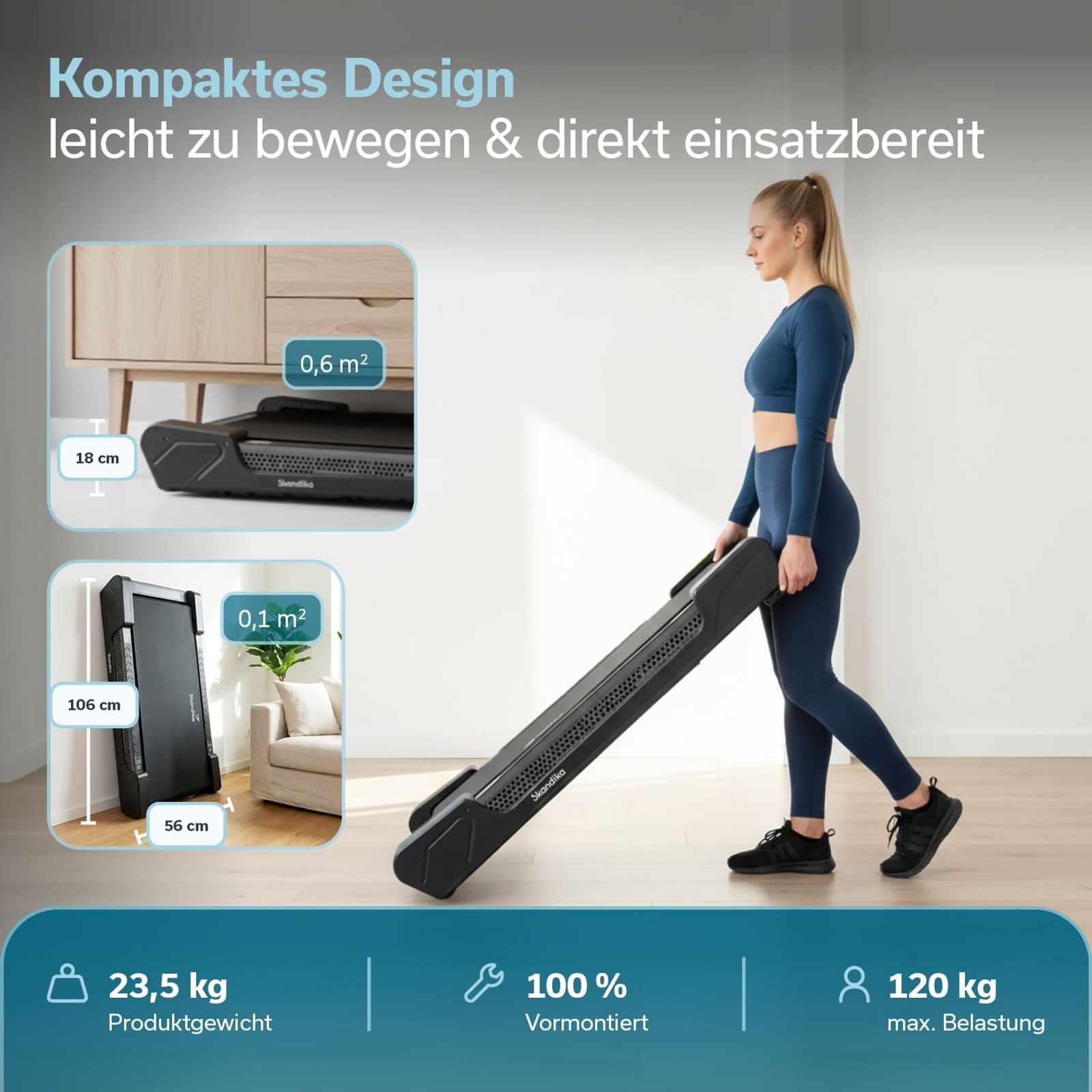 Vorne mit Transportrollen ausgestattet lässt sich das Gerät leicht hinten anheben und mühelos im Raum verschieben. Das handliche Gewicht von 23,5 kg erleichtert den Standortwechsel zusätzlich. So ist das Walking Pad schnell am gewünschten Einsatzort positioniert und bei Bedarf ebenso zügig wieder weggeräumt.
