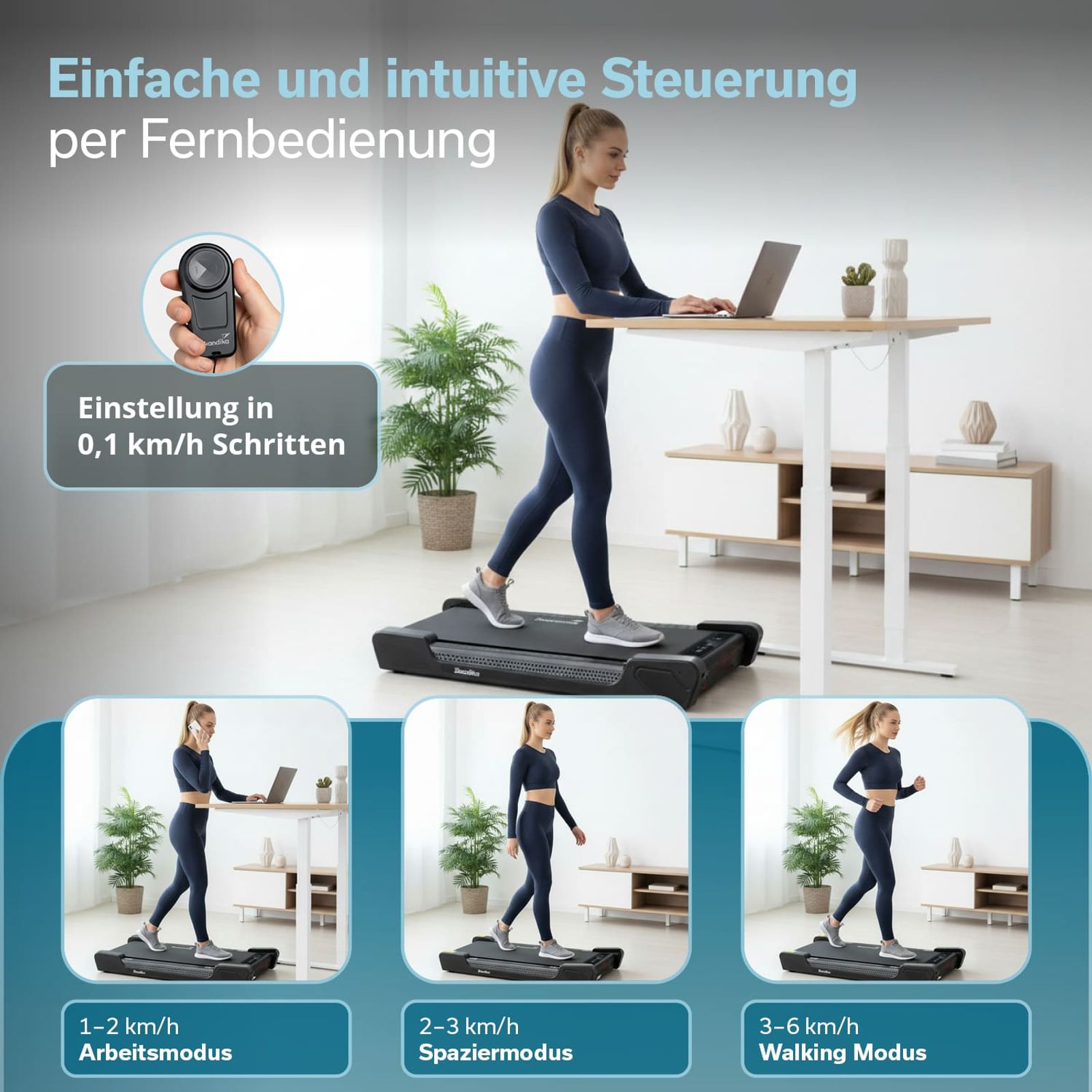 Die mitgelieferte Fernbedienung mit Schlaufe ermöglicht eine bequeme Steuerung ohne Unterbrechung des Trainings. Die Geschwindigkeit lässt sich präzise in 0,1 km/h Schritten von 1 bis 6 km/h einstellen. Für optimale Sicherheit kann das Training ebenfalls schnell und einfach per Knopfdruck gestoppt werden.