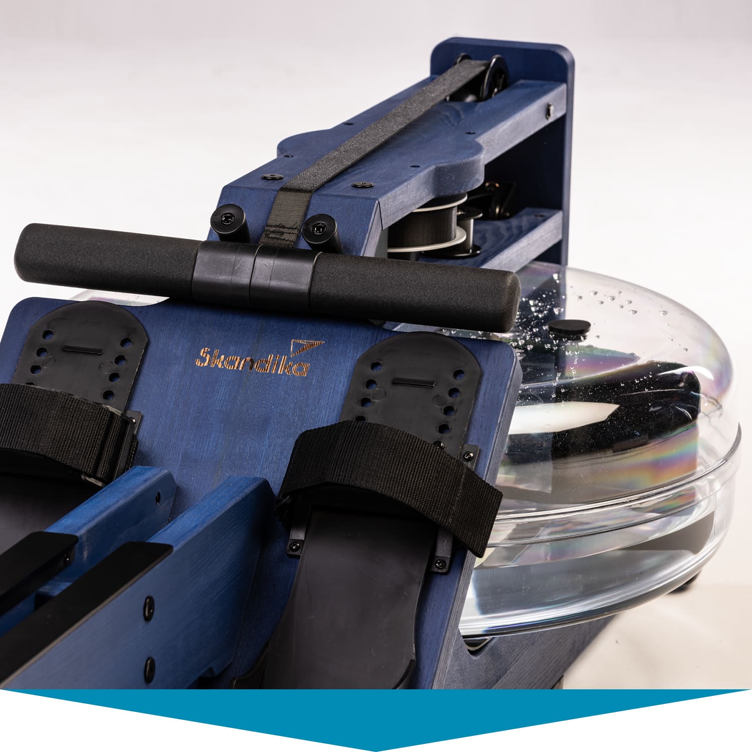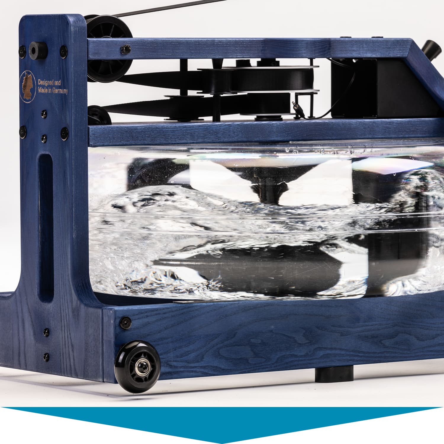 Herzstück des Styrke Premium: das wassergebremste Zugsystem. Im Inneren des bruchsicheren Wassertanks arbeitet ein Paddel. Es sorgt dafür, dass sich Rudern auf dem Styrke Premium auch wie Rudern anfühlt. Der Ruderwiderstand variiert je nach Ruderfrequenz und Füllmenge des Tanks. Dieser lässt sich mit 10 bis 15 Litern befüllen – je voller, desto höher der Widerstand.