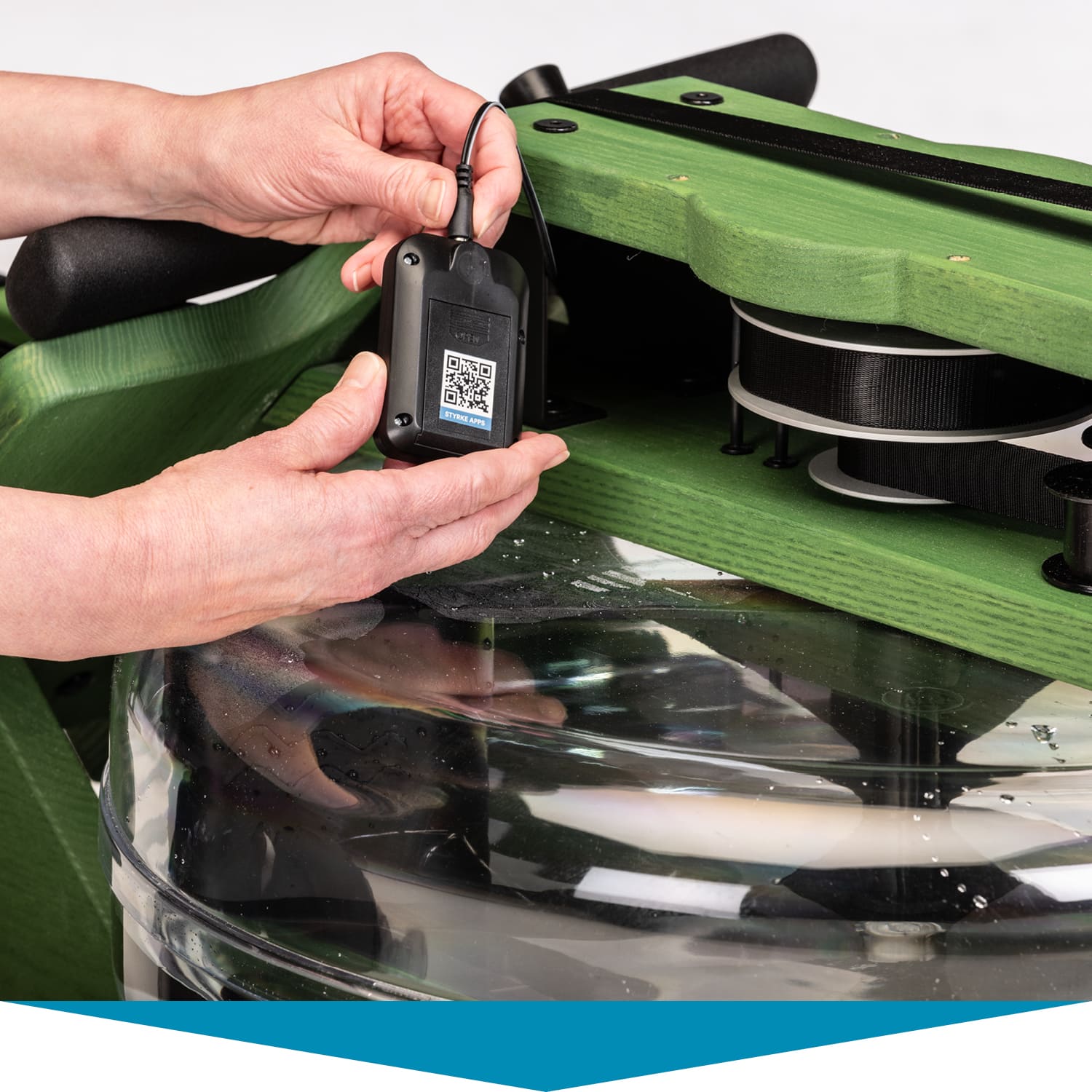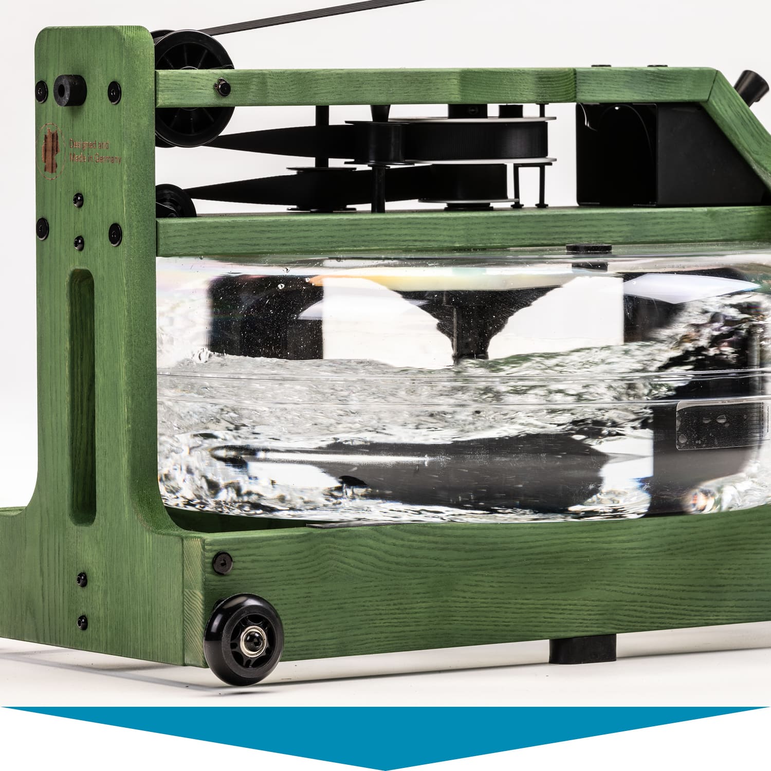Herzstück des Styrke Premium: das wassergebremste Zugsystem. Im Inneren des bruchsicheren Wassertanks arbeitet ein Paddel. Es sorgt dafür, dass sich Rudern auf dem Styrke Premium auch wie Rudern anfühlt. Der Ruderwiderstand variiert je nach Ruderfrequenz und Füllmenge des Tanks. Dieser lässt sich mit 10 bis 15 Litern befüllen – je voller, desto höher der Widerstand.