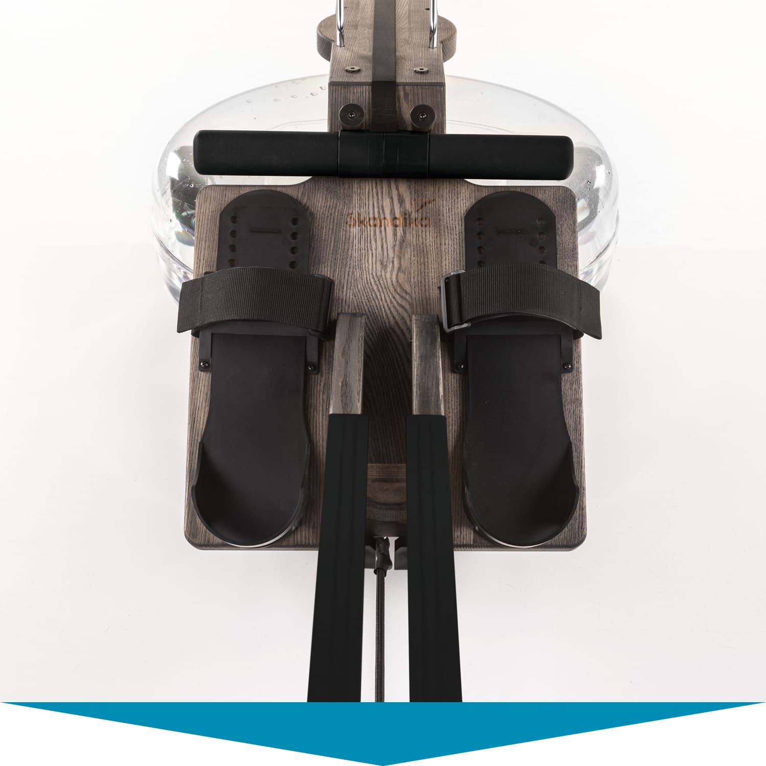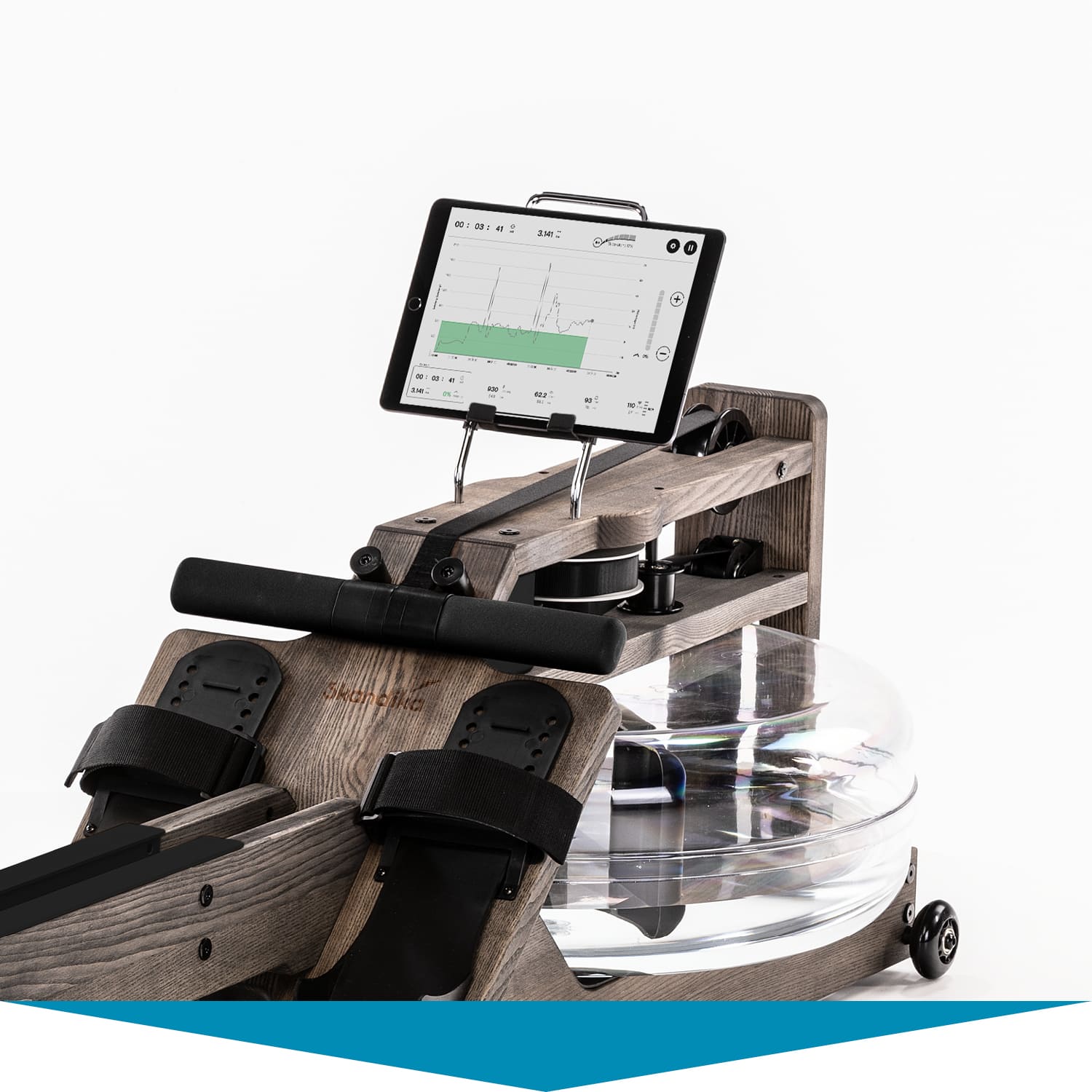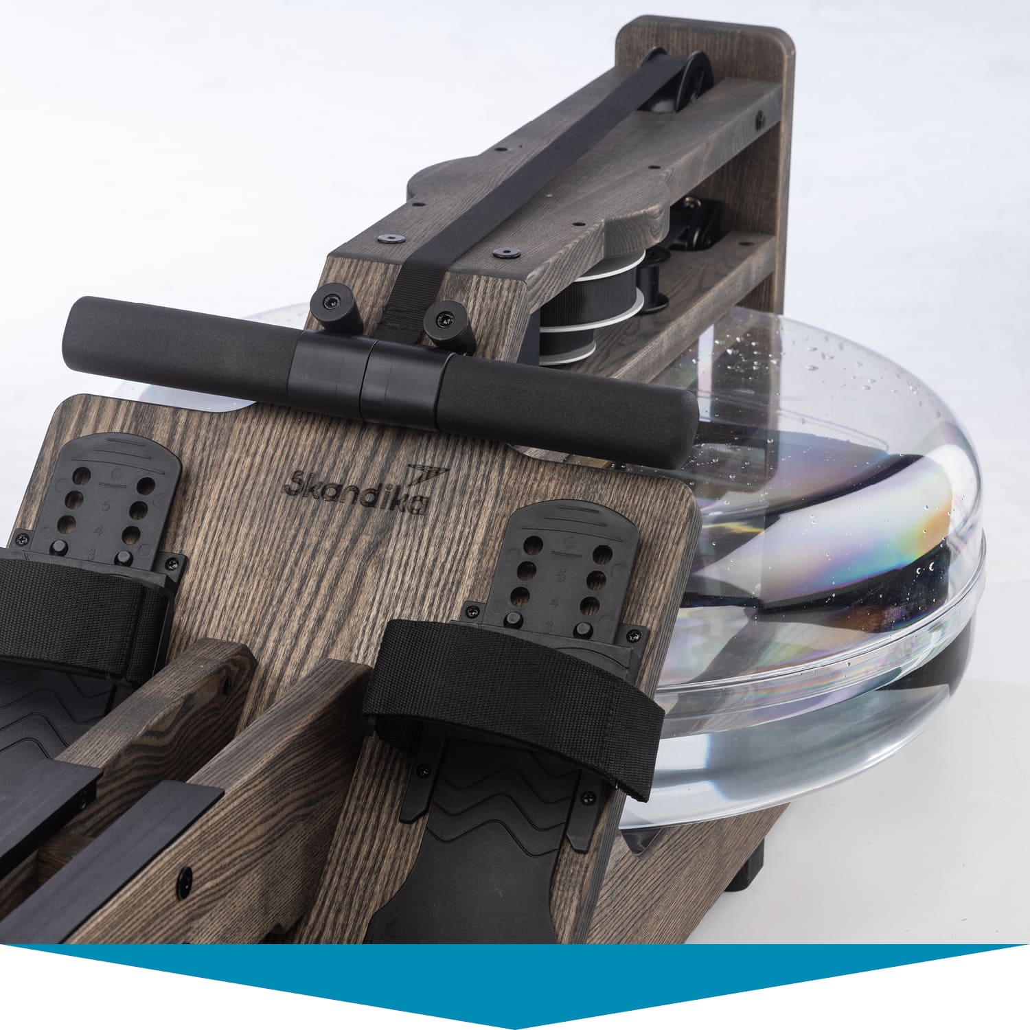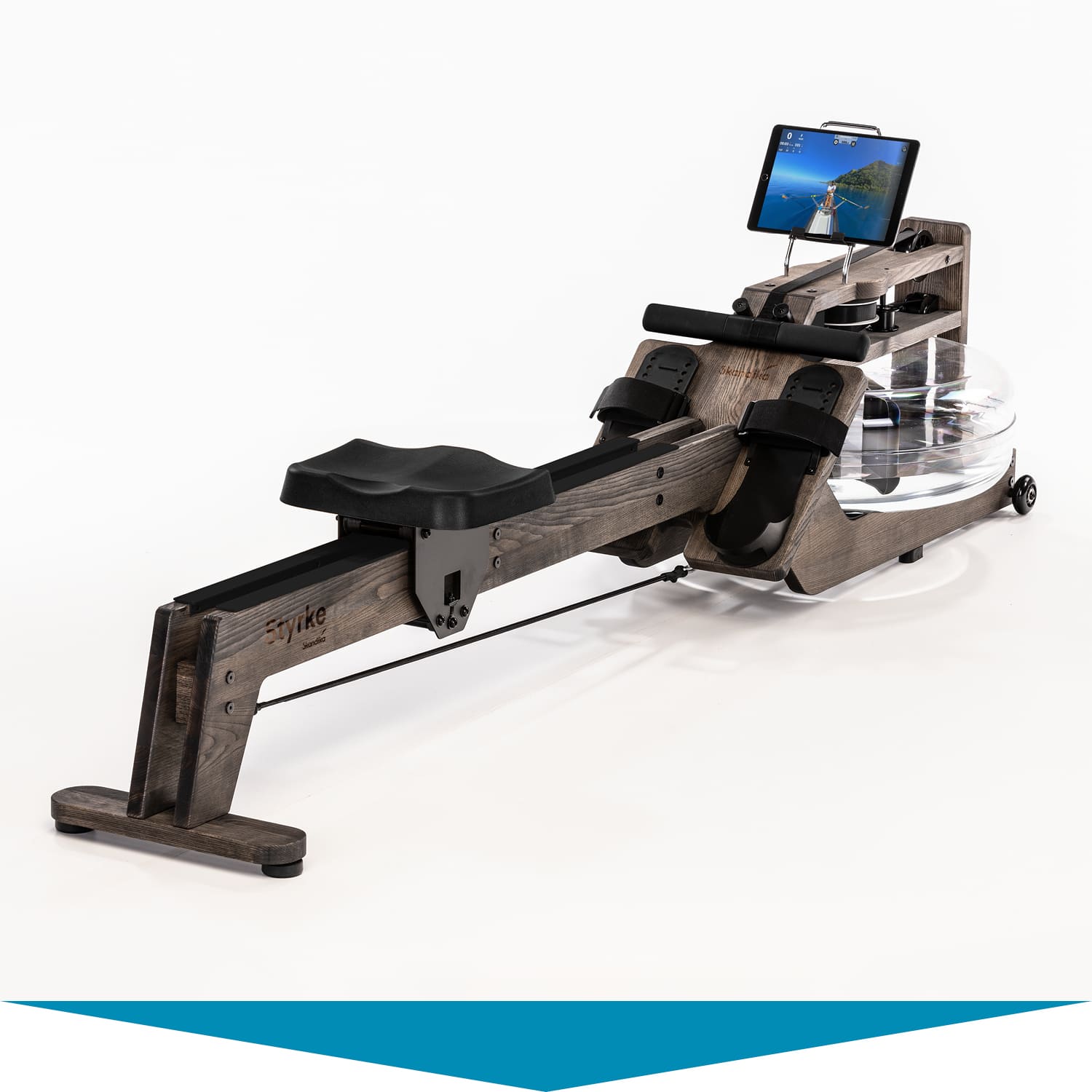Herzstück des Styrke: das wassergebremste Zugsystem. Im Inneren des bruchsicheren Wassertanks arbeitet ein Paddel. Es sorgt dafür, dass sich Rudern auf dem Styrke auch wie Rudern anfühlt. Der Ruderwiderstand variiert je nach Ruderfrequenz und Füllmenge des Tanks. Dieser lässt sich mit 10 bis 15 Litern befüllen – je voller, desto höher der Widerstand.