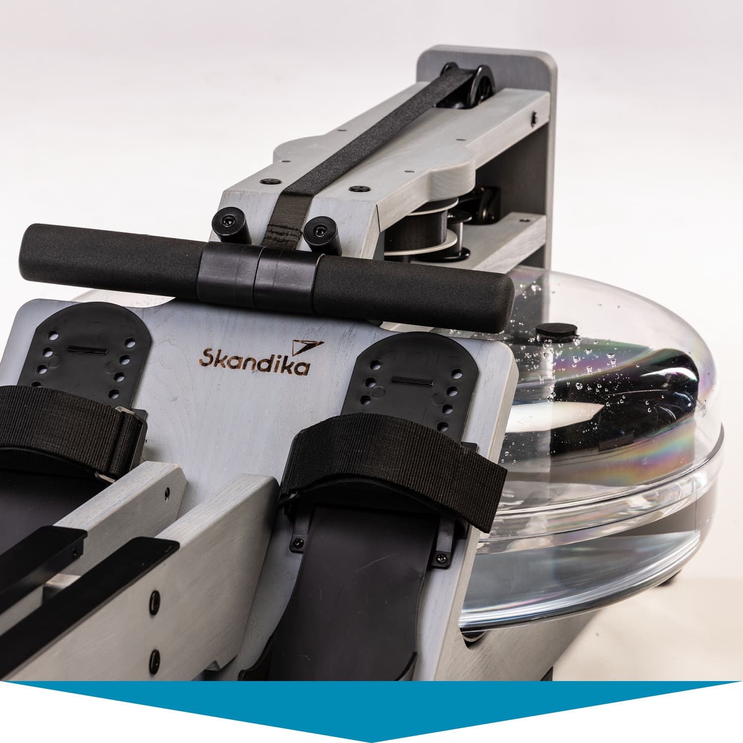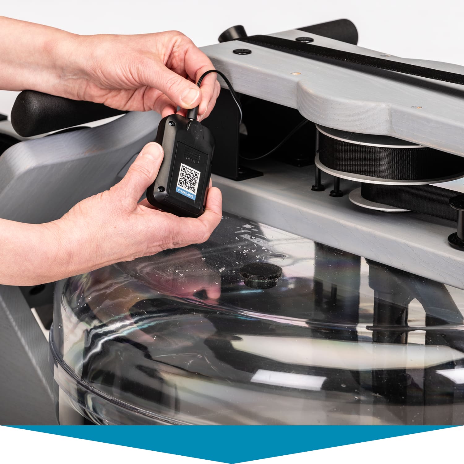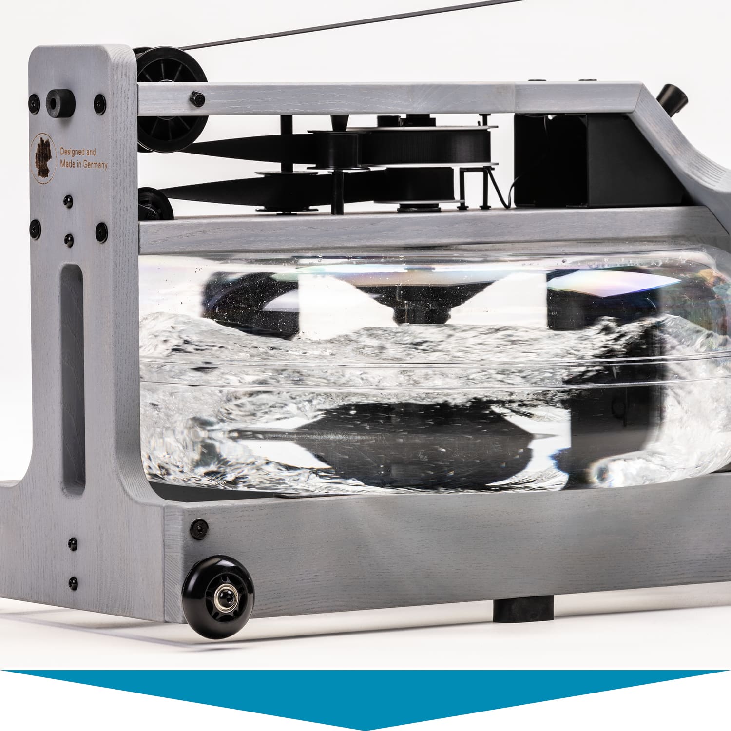 Herzstück des Styrke Premium: das wassergebremste Zugsystem. Im Inneren des bruchsicheren Wassertanks arbeitet ein Paddel. Es sorgt dafür, dass sich Rudern auf dem Styrke Premium auch wie Rudern anfühlt. Der Ruderwiderstand variiert je nach Ruderfrequenz und Füllmenge des Tanks. Dieser lässt sich mit 10 bis 15 Litern befüllen – je voller, desto höher der Widerstand.