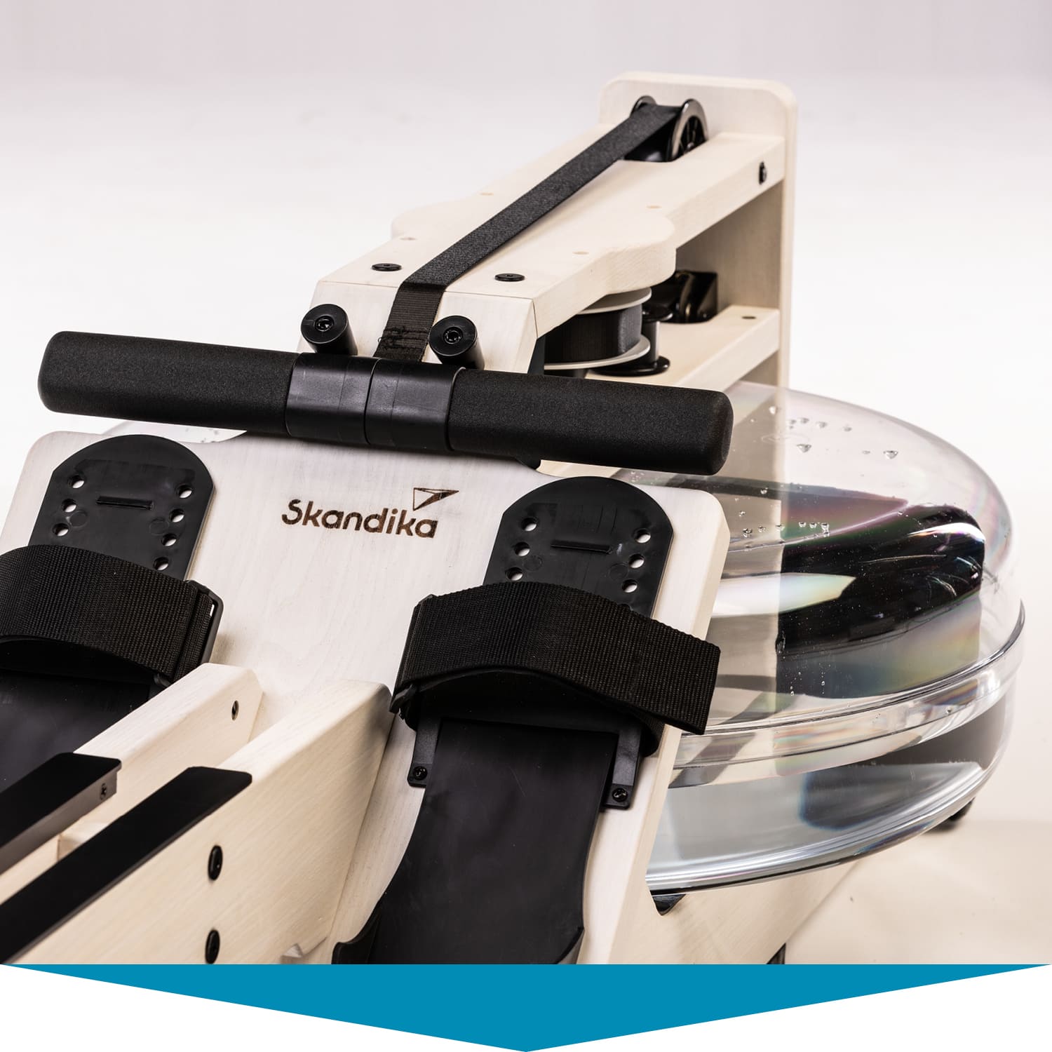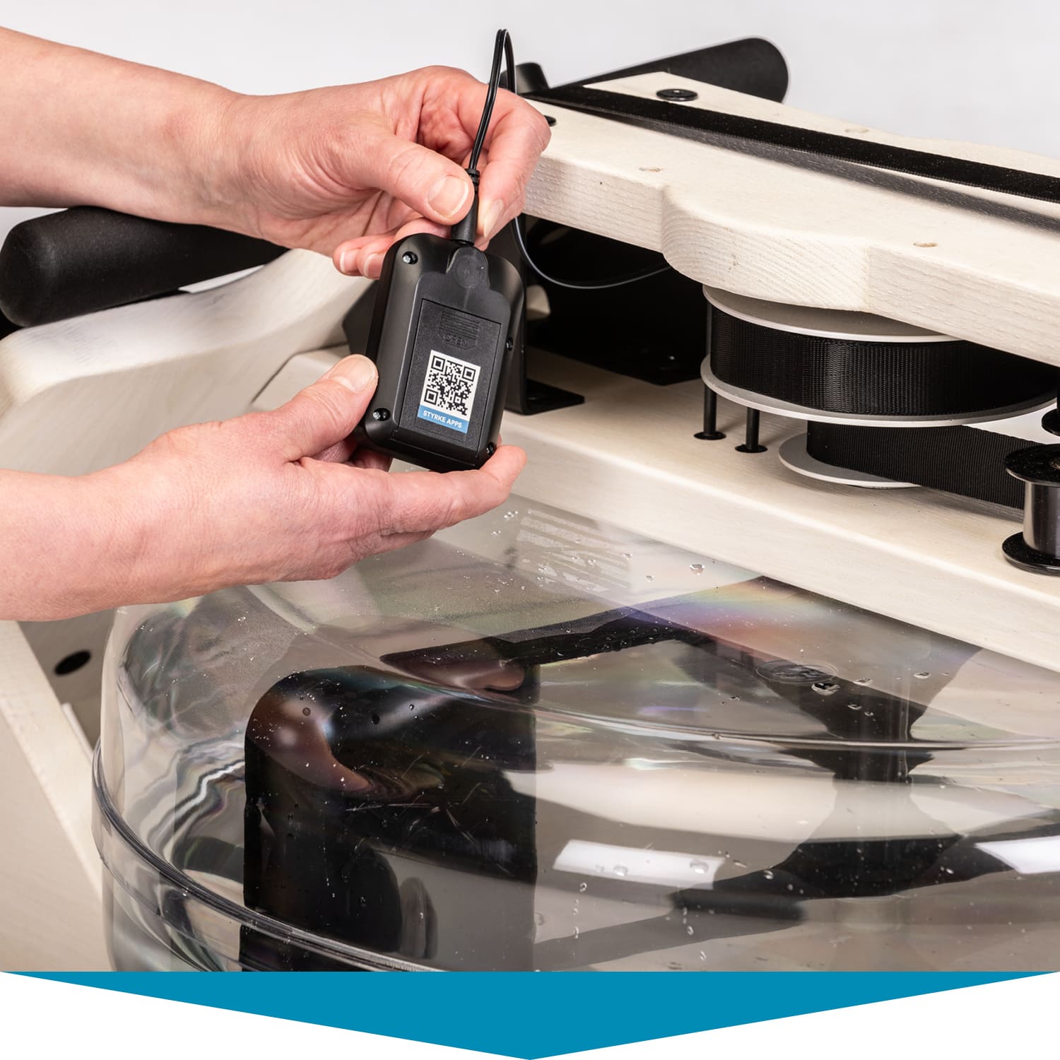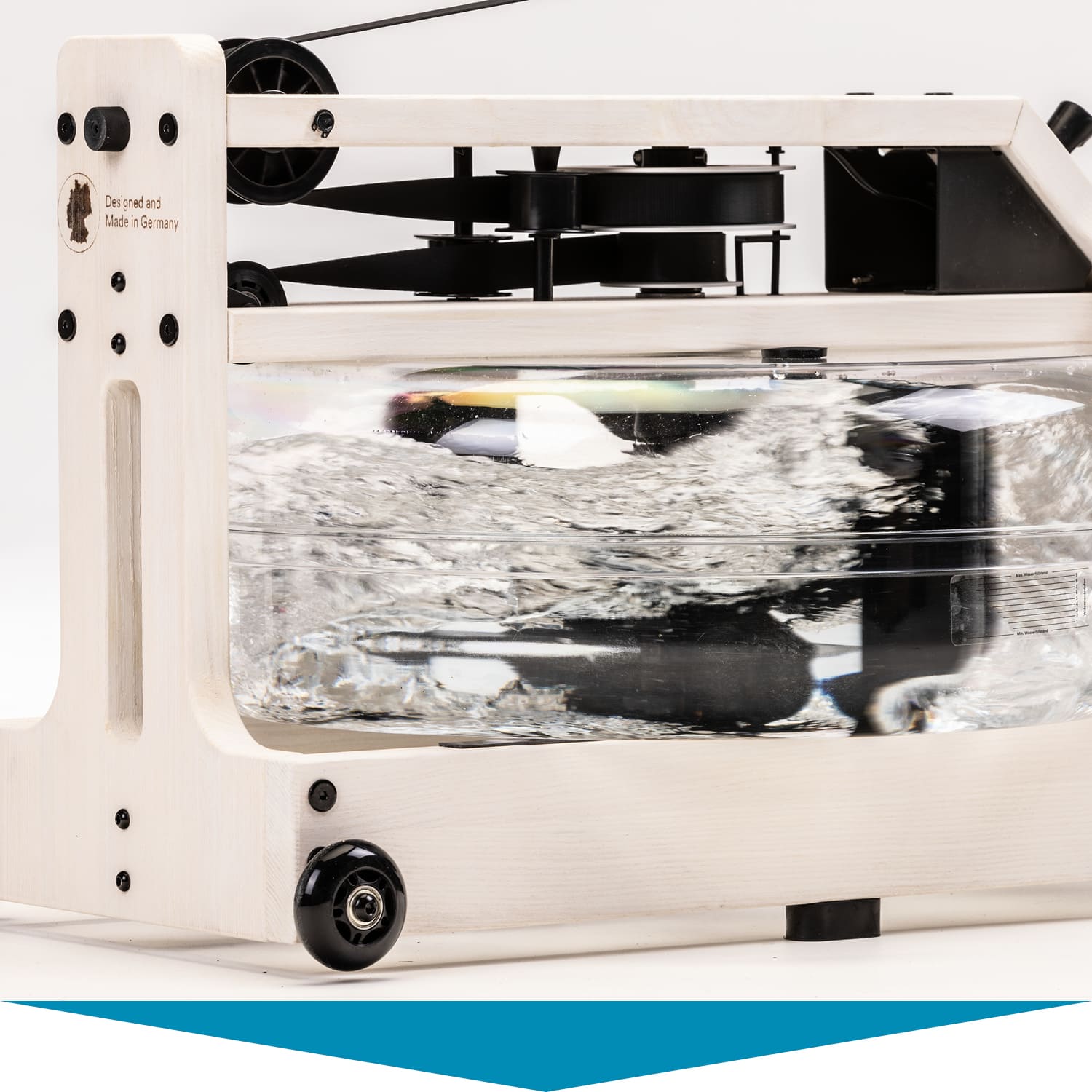 Herzstück des Styrke Premium: das wassergebremste Zugsystem. Im Inneren des bruchsicheren Wassertanks arbeitet ein Paddel. Es sorgt dafür, dass sich Rudern auf dem Styrke Premium auch wie Rudern anfühlt. Der Ruderwiderstand variiert je nach Ruderfrequenz und Füllmenge des Tanks. Dieser lässt sich mit 10 bis 15 Litern befüllen – je voller, desto höher der Widerstand.