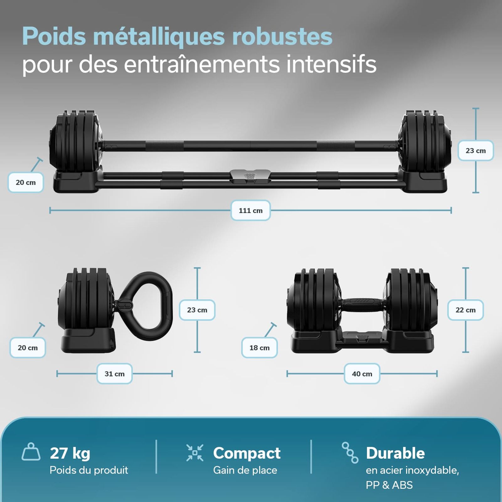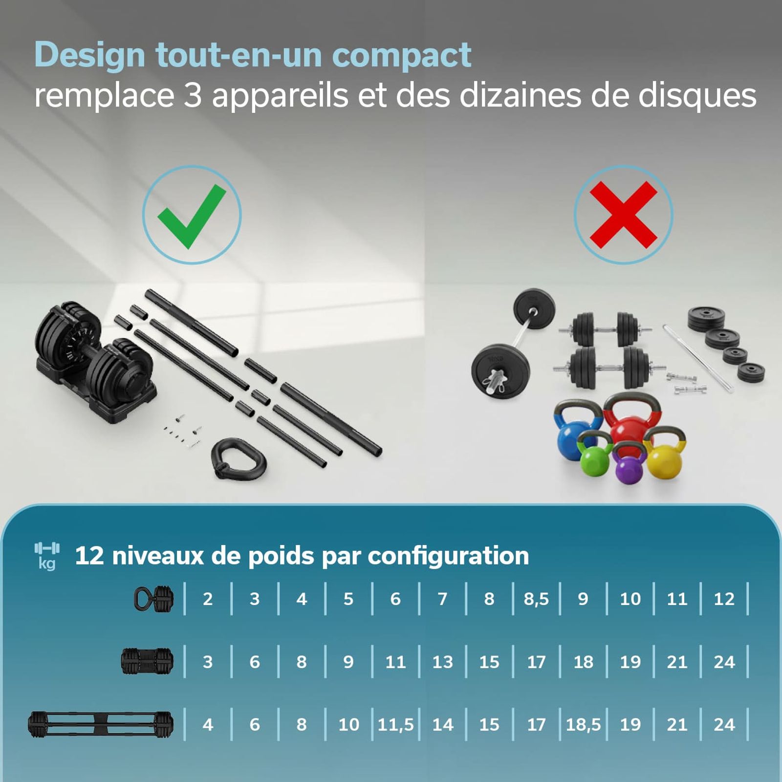Haltère court, haltère long et kettlebell avec 12 niveaux de poids