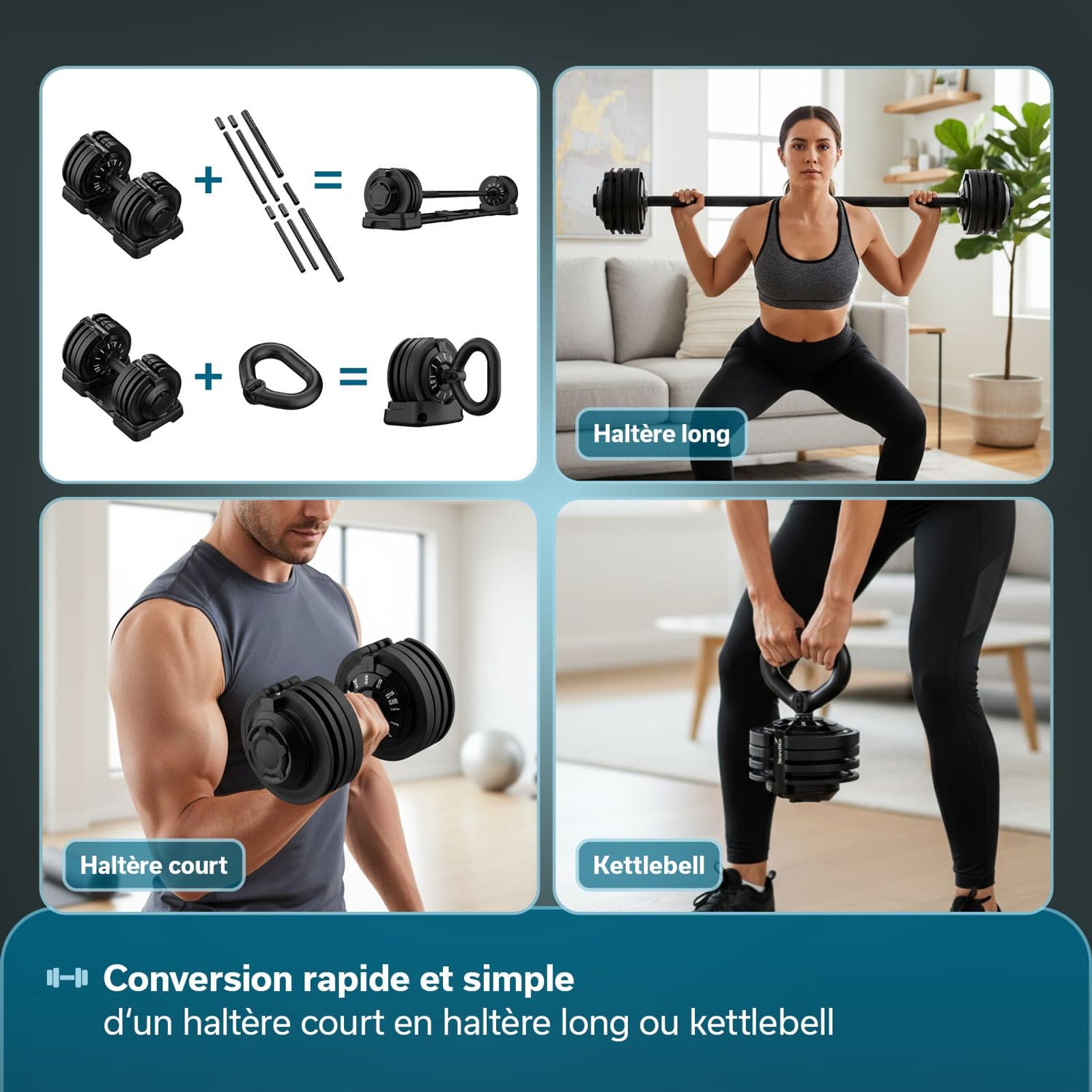 Cet ensemble combine haltères courts, haltères longs et kettlebells dans un système compact. Les exercices d'isolation classiques tels que les flexions des biceps, les exercices composés à deux mains tels que le développé couché et l'entraînement fonctionnel avec des swings sont possibles avec un seul ensemble de poids.