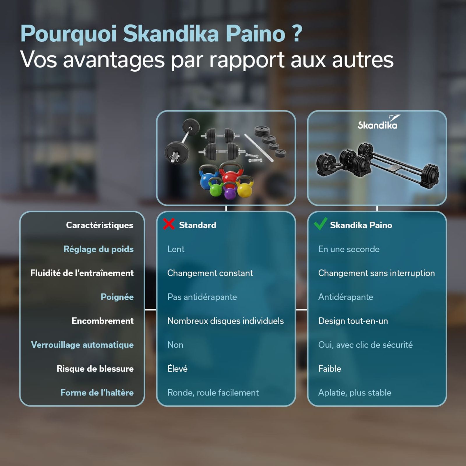 Le set 3 en 1 fait partie de la gamme complète Paino de Skandika, qui comprend différents haltères, un set d'haltères et un kettlebell. Cette gamme coordonnée offre de nombreuses possibilités d'entraînement à domicile.