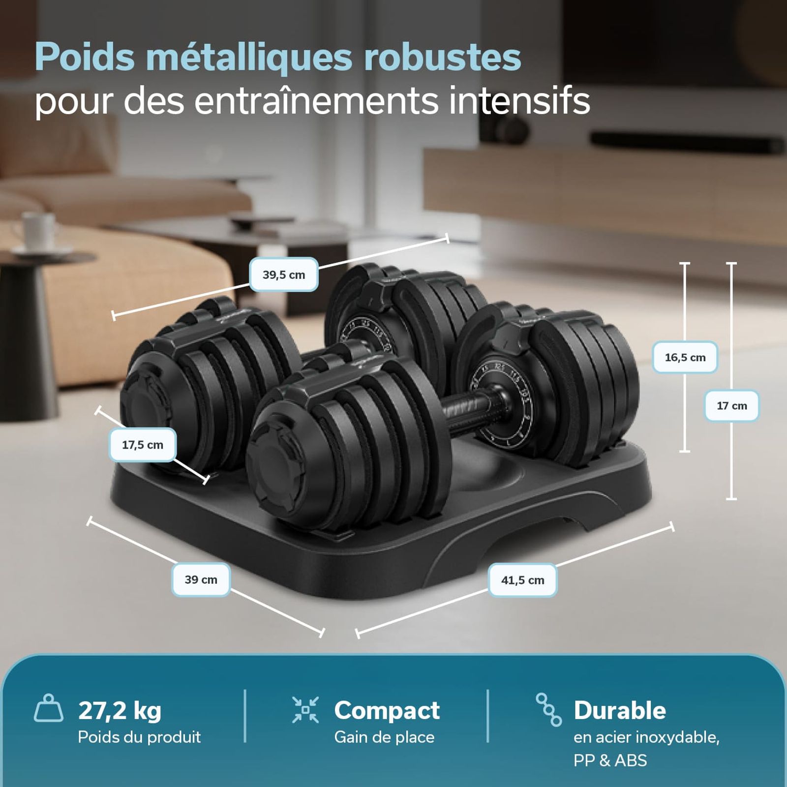 • Dimensions par haltère : 39,5 × 17,5 × 16,5 cm, dimensions totales avec support : 41,5 × 39 × 17 cm