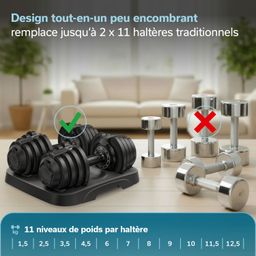 • Le design tout-en-un peu encombrant remplace onze paires d'haltères séparées et permet de garder votre espace d'entraînement bien rangé