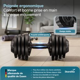 Avec le set d'haltères Paino de Skandika, vous disposez dans votre salle de sport à domicile d'une paire d'haltères réglables qui séduit par son système de changement rapide innovant, son design tout-en-un peu encombrant et sa flexibilité maximale. Deux haltères avec onze niveaux de poids chacun permettent un entraînement de musculation individuel et progressif, idéal pour les débutants et les utilisateurs avancés qui apprécient le confort et la polyvalence. Le système de verrouillage automatique intelligent facilite le changement de poids et garantit des entraînements efficaces sans interruptions inutiles.