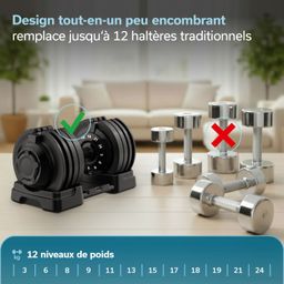 • Conception tout-en-un peu encombrante qui remplace douze haltères séparés et permet de gagner un espace d'entraînement précieux